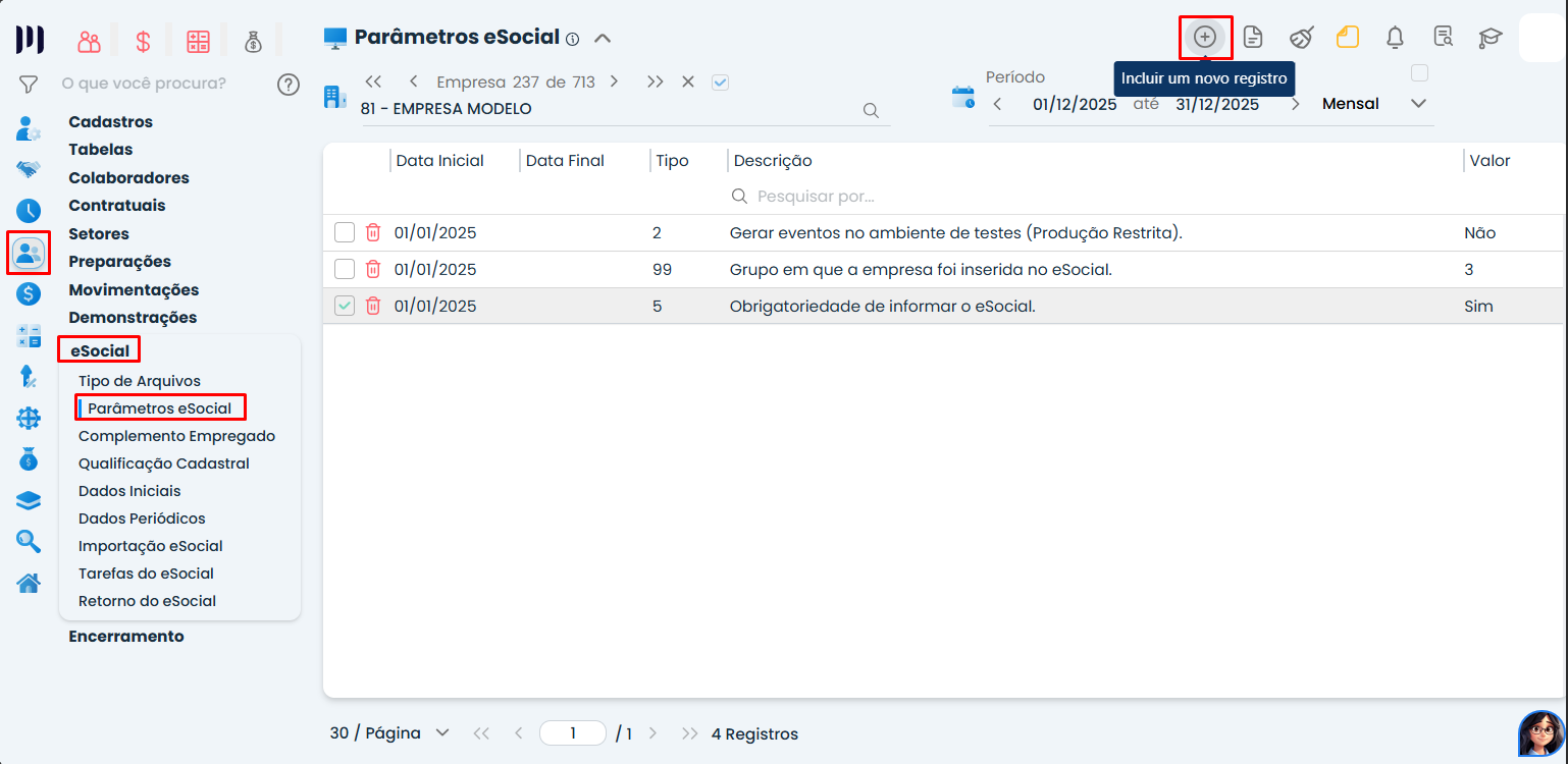 Passo 1: Acesse o menu Pessoal>eSocial, e clique em Parâmetros eSocial.