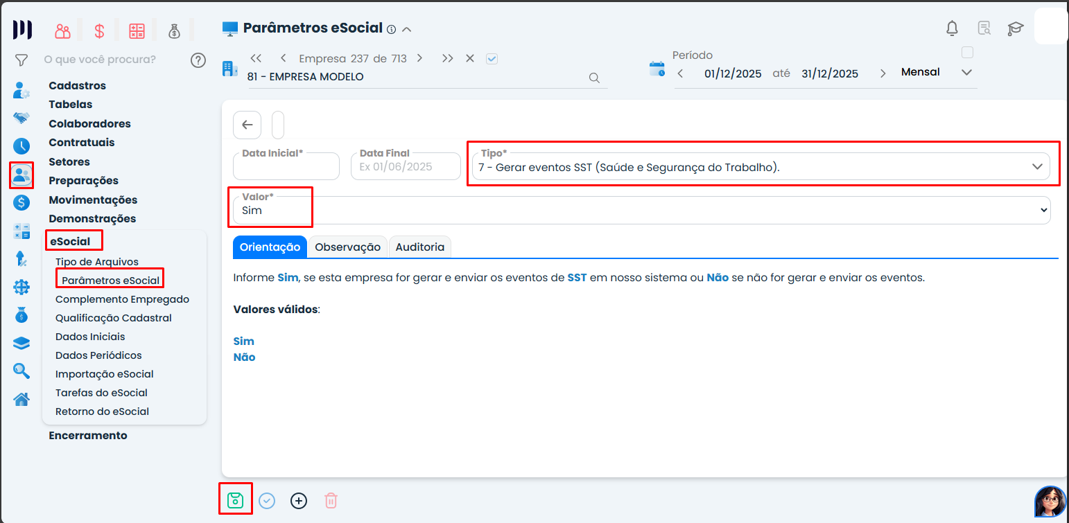 Passo 3: Cadastre o parâmetro do tipo 7, com o valor “Sim”, e defina a data inicial para início dos envios SST.
