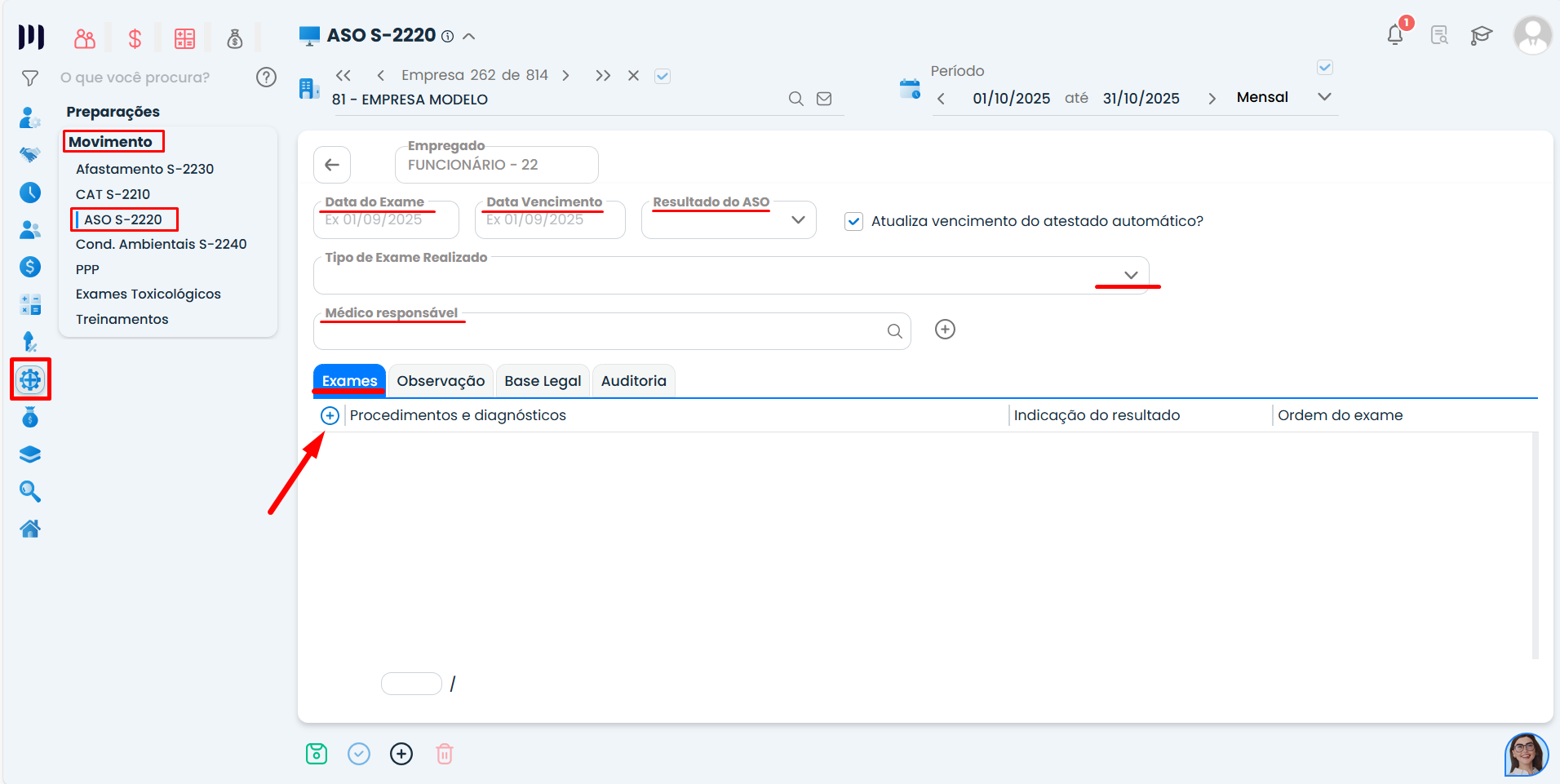 Passo 5: Ainda dentro do ASO, poderá incluir (+) as informações referentes a exames e procedimentos realizados.