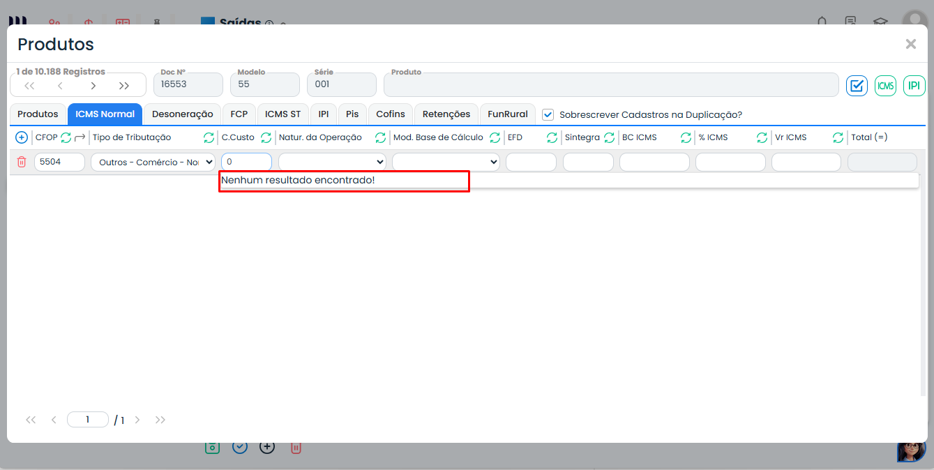 Caso seja exibida a mensagem “Nenhum resultado encontrado” ao tentar cadastrar o Centro de Custo na Nota Fiscal, é necessário realizar previamente o cadastro de um Centro de Custo vinculado ao CFOP correspondente informado no documento fiscal.