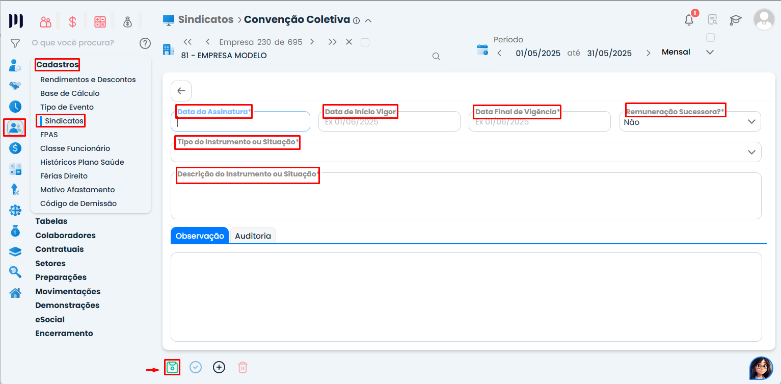 🔎 Para evitar inconsistências, mantenha o cadastro da convenção sempre atualizado conforme os documentos oficiais fornecidos pelo sindicato.