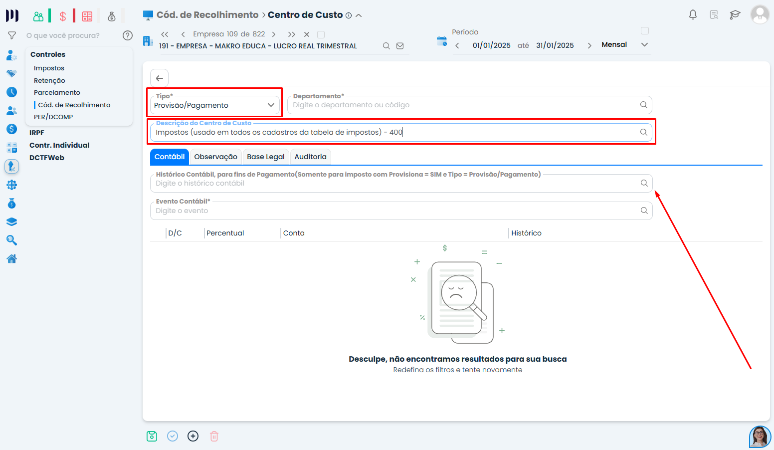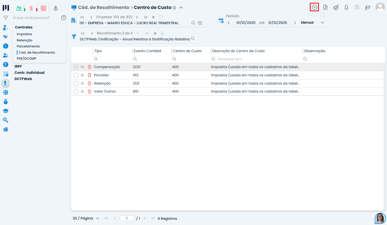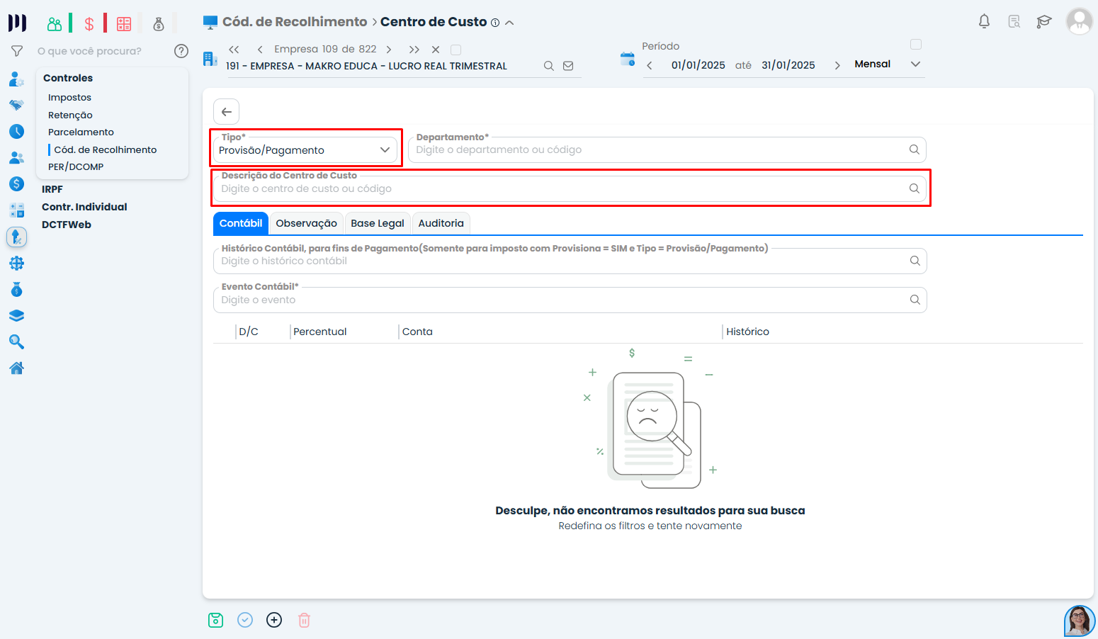 Certifique-se de selecionar o código de recolhimento correto antes de adicionar centros de custo