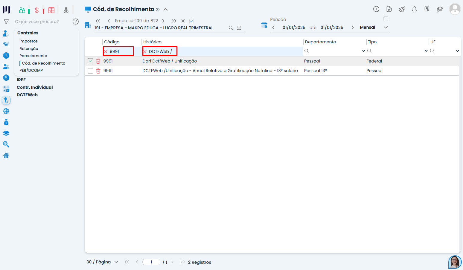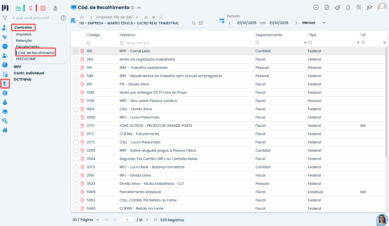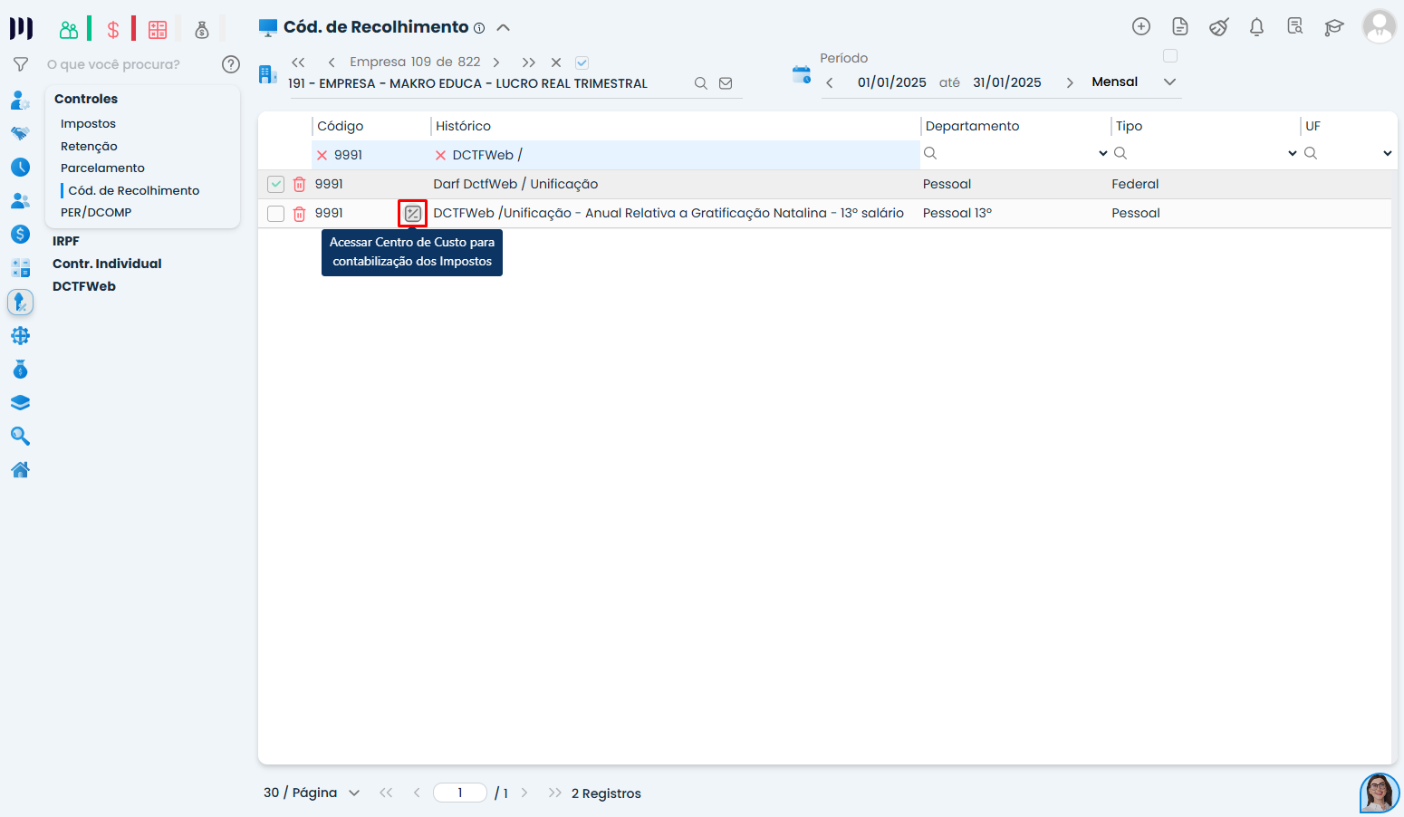 Certifique-se de selecionar o código de recolhimento correto antes de adicionar centros de custo