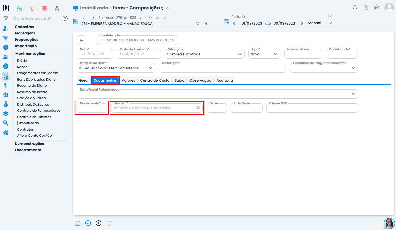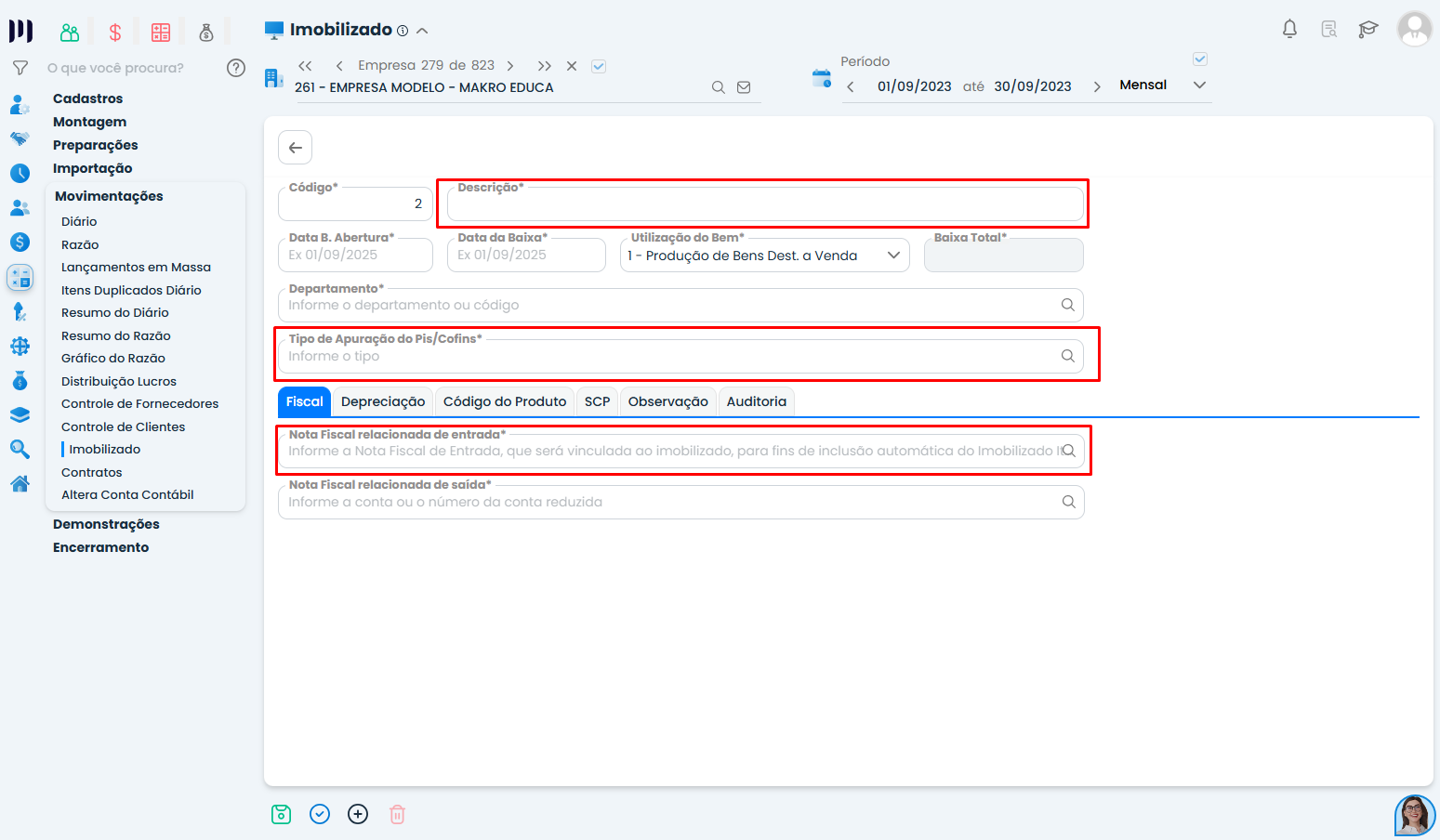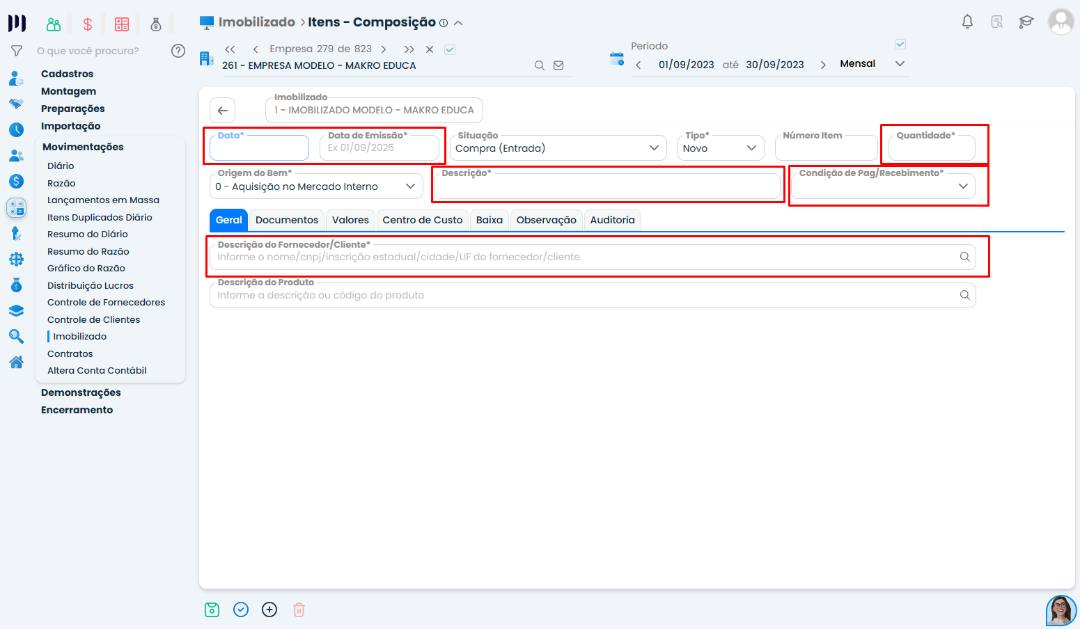 Localização: Contábil > Movimentações > Imobilizado > Incluir novo registro