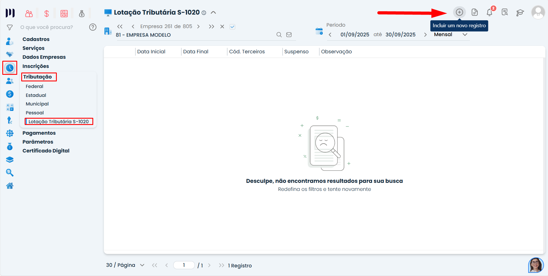 Clique no ícone “Incluir um novo registro” para iniciar o cadastro;