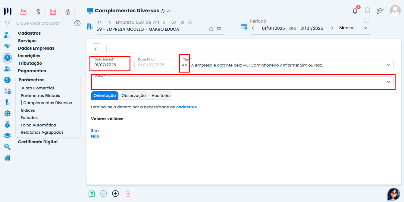 Preparar > Parâmetros > Complemento Diversos - Localize o campo do Tipo 44