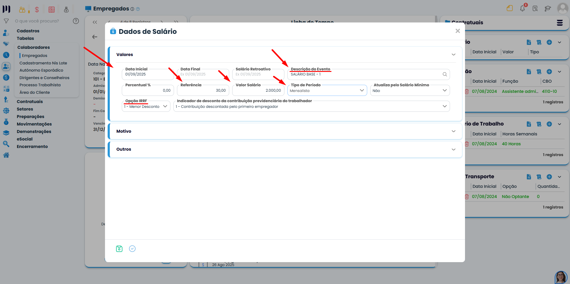 Passo 3: Preencha todas as informações necessárias, como o tipo de salário (mensalista, diarista, horista, etc.), valores, e dados relacionados ao vale transporte ou outros benefícios;