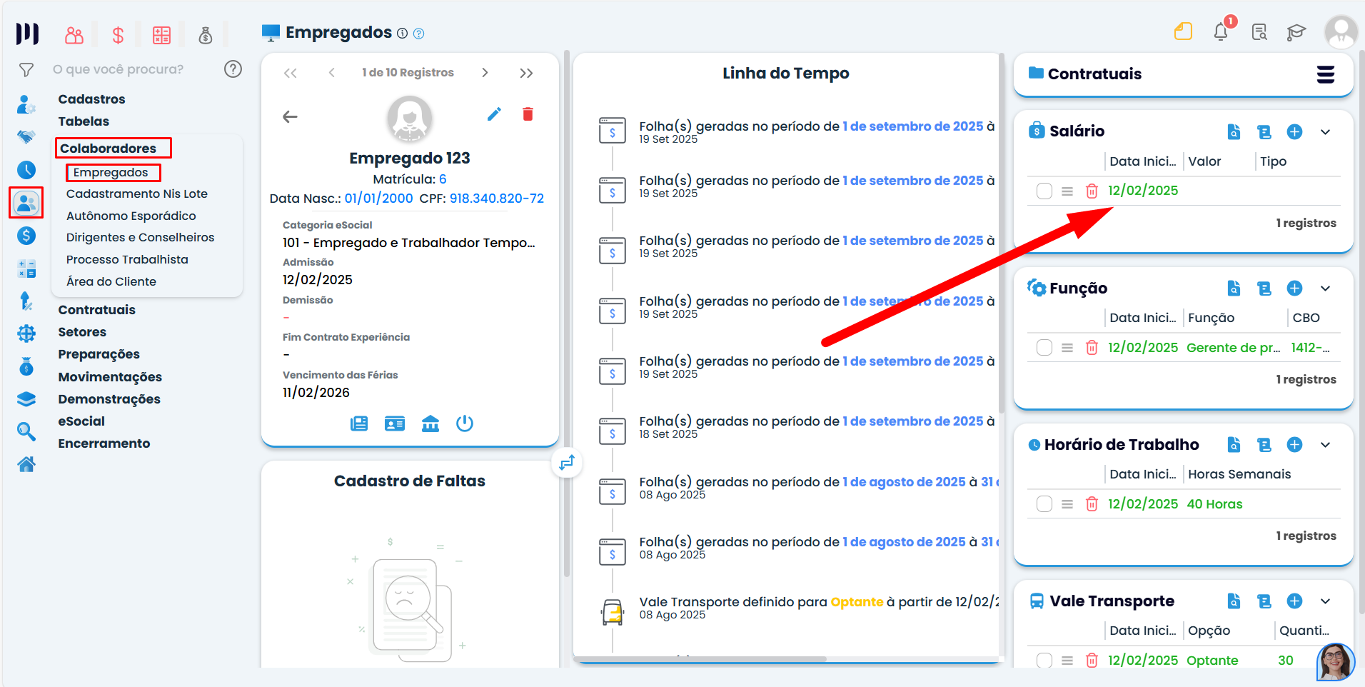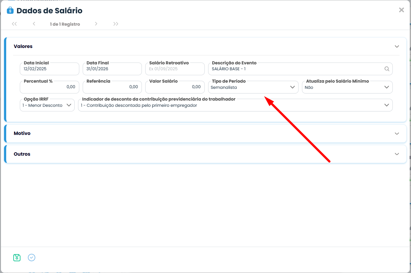 - Preencha data inicial, evento a ser utilizado, valor do salário, e salve o cadastro.