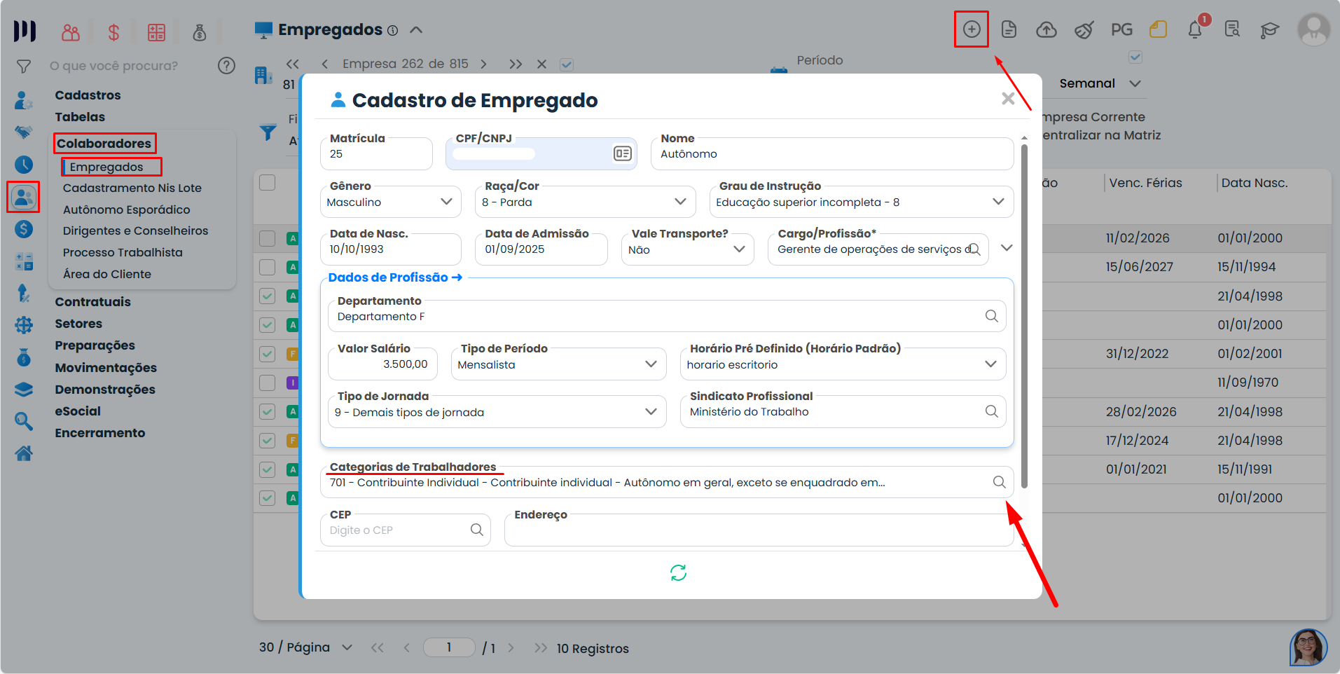 Dica: Se o autônomo já estiver cadastrado como empregado, não é necessário cadastrá-lo novamente aqui.