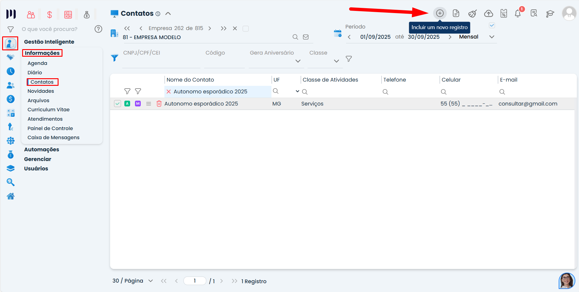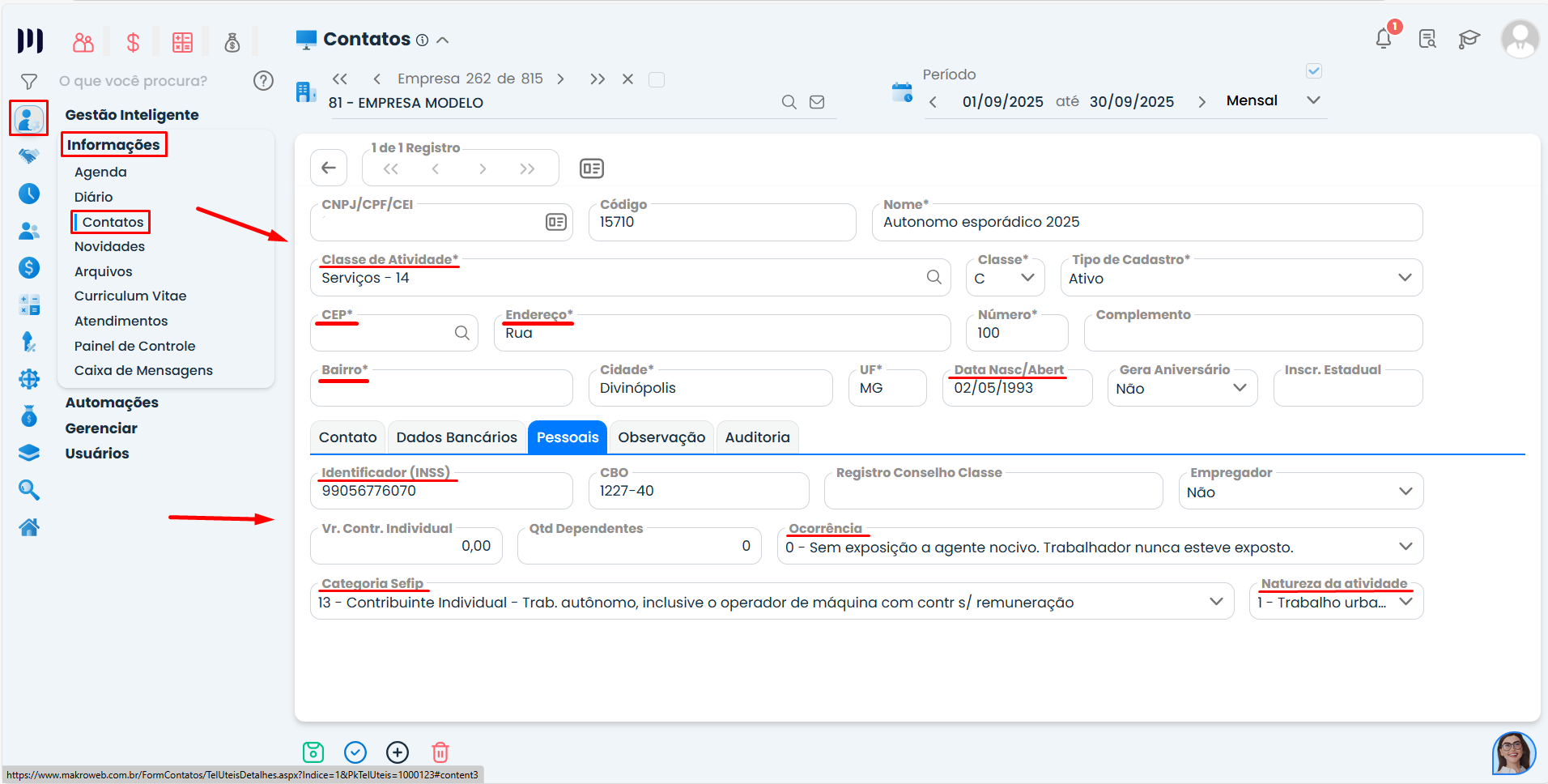 - Inclua o mesmo profissional já registrado nos contatos, preenchendo data inicial e final de prestação de serviço e categoria do autônomo;
