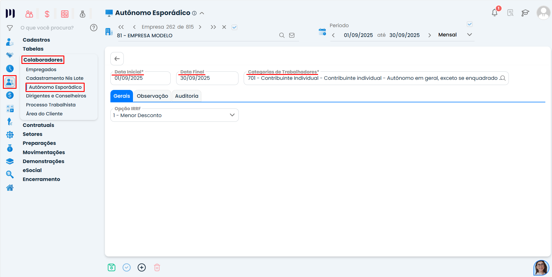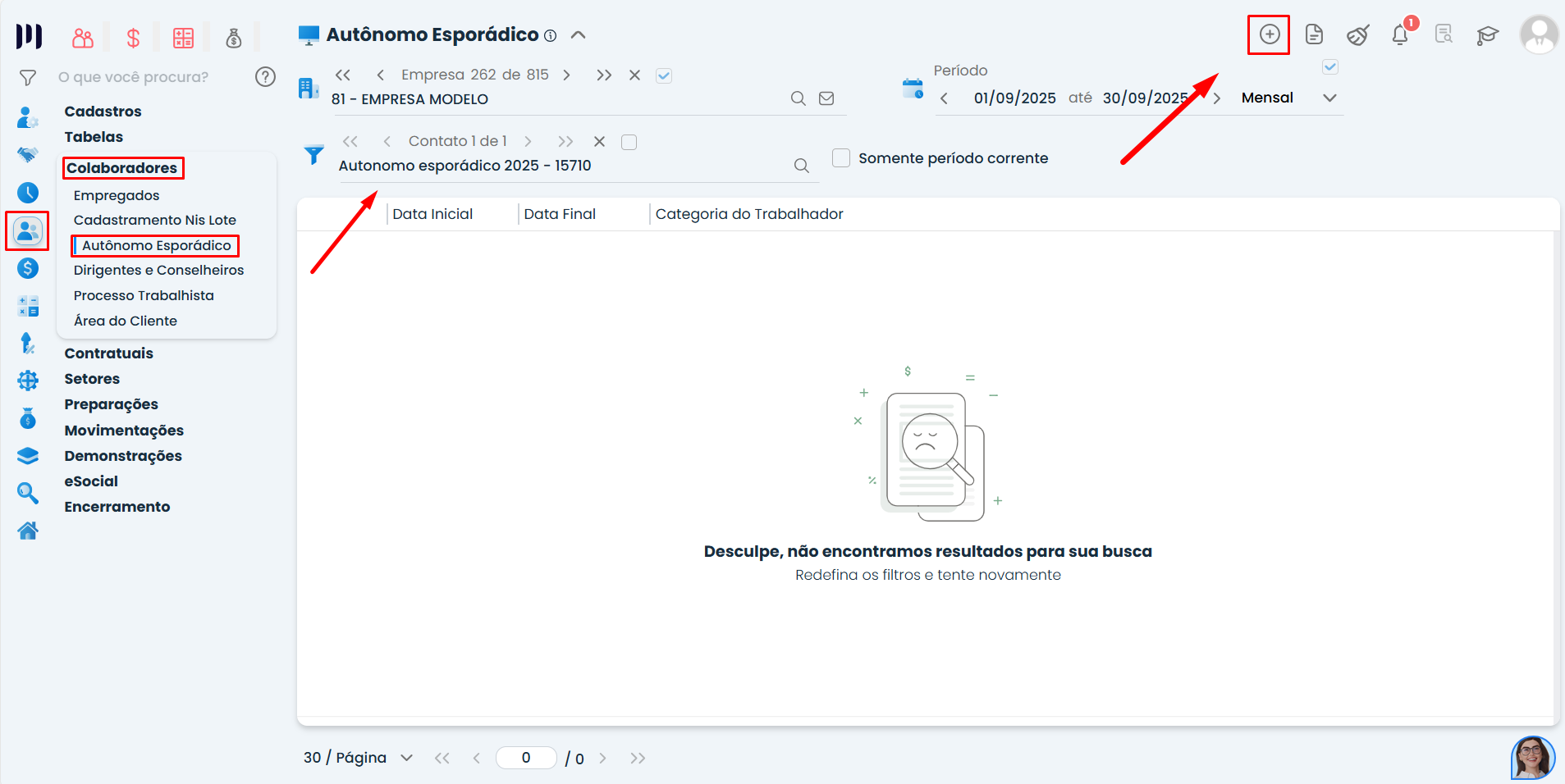 - Acesse o menu Pessoal → Colaboradores → Autônomo Esporádico;