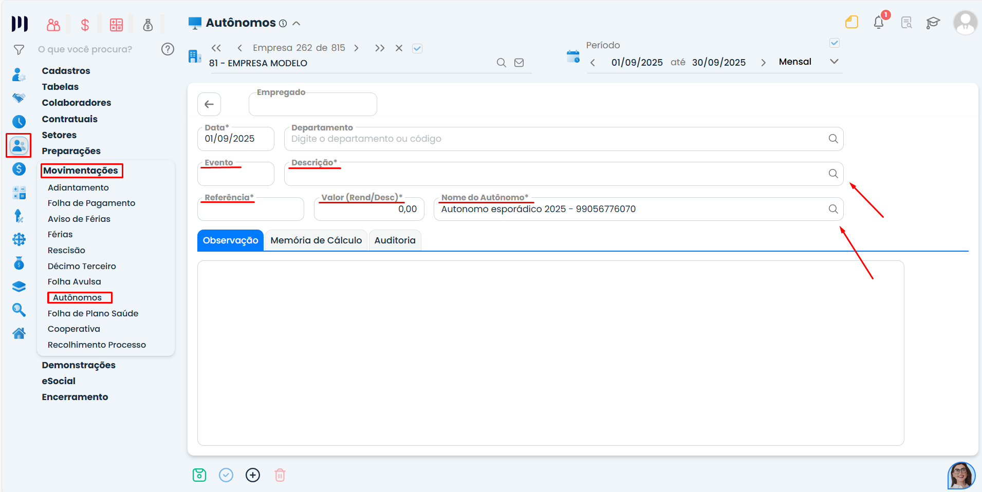 - Clique em “Incluir um novo registro”, insira os eventos e os valores de pagamento, identificando o autônomo que será calculado o valor incluído;