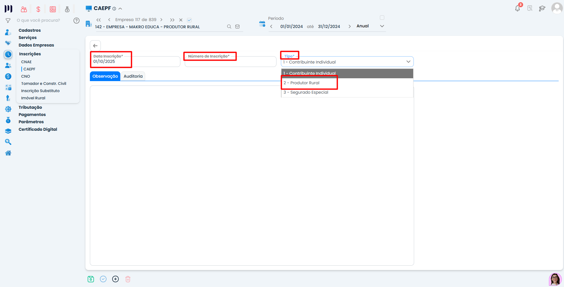 Tipo: Selecione “2 – Produtor Rural”