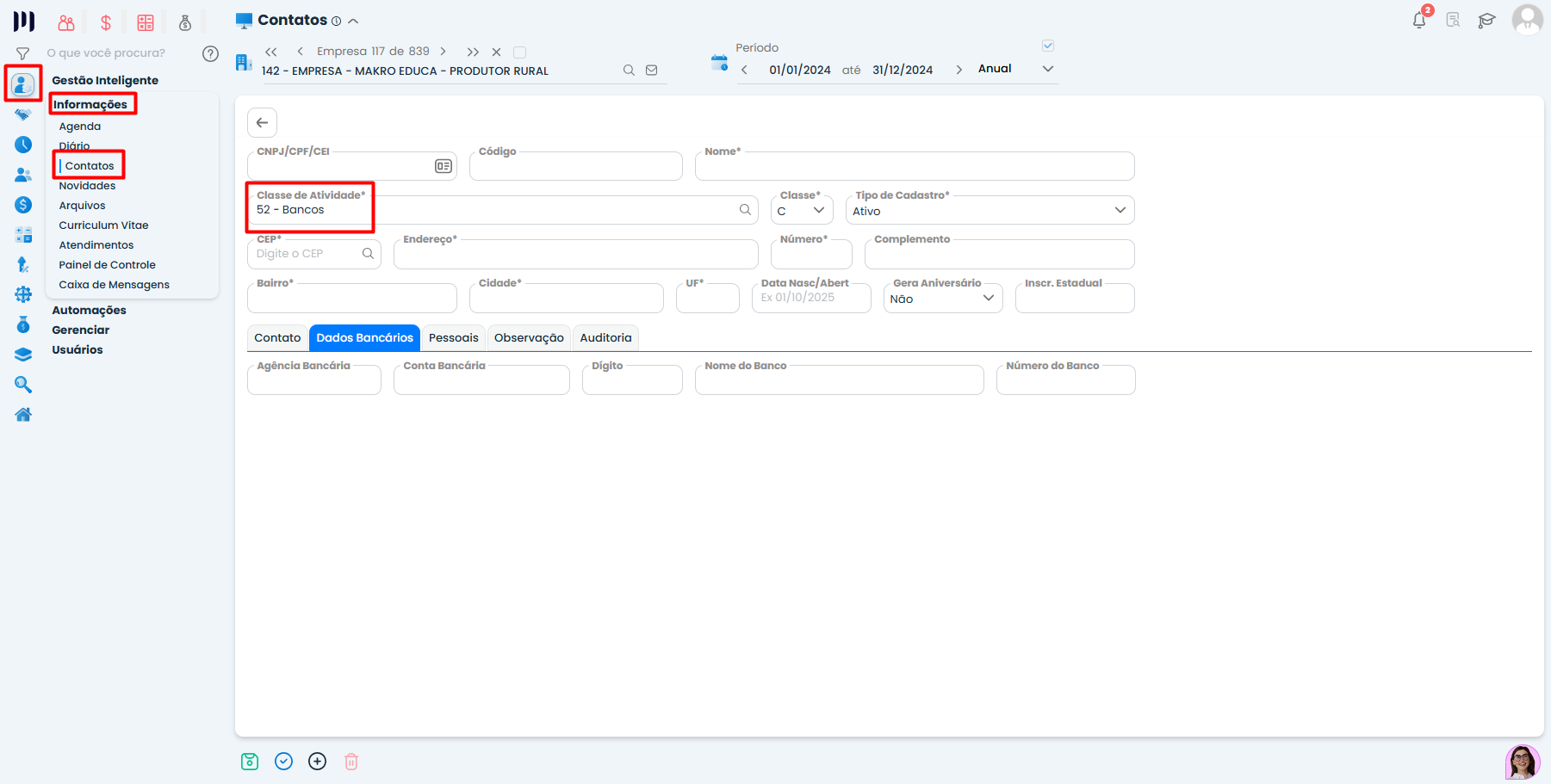 No campo Classe de Atividade, selecione: “52 – Bancos”