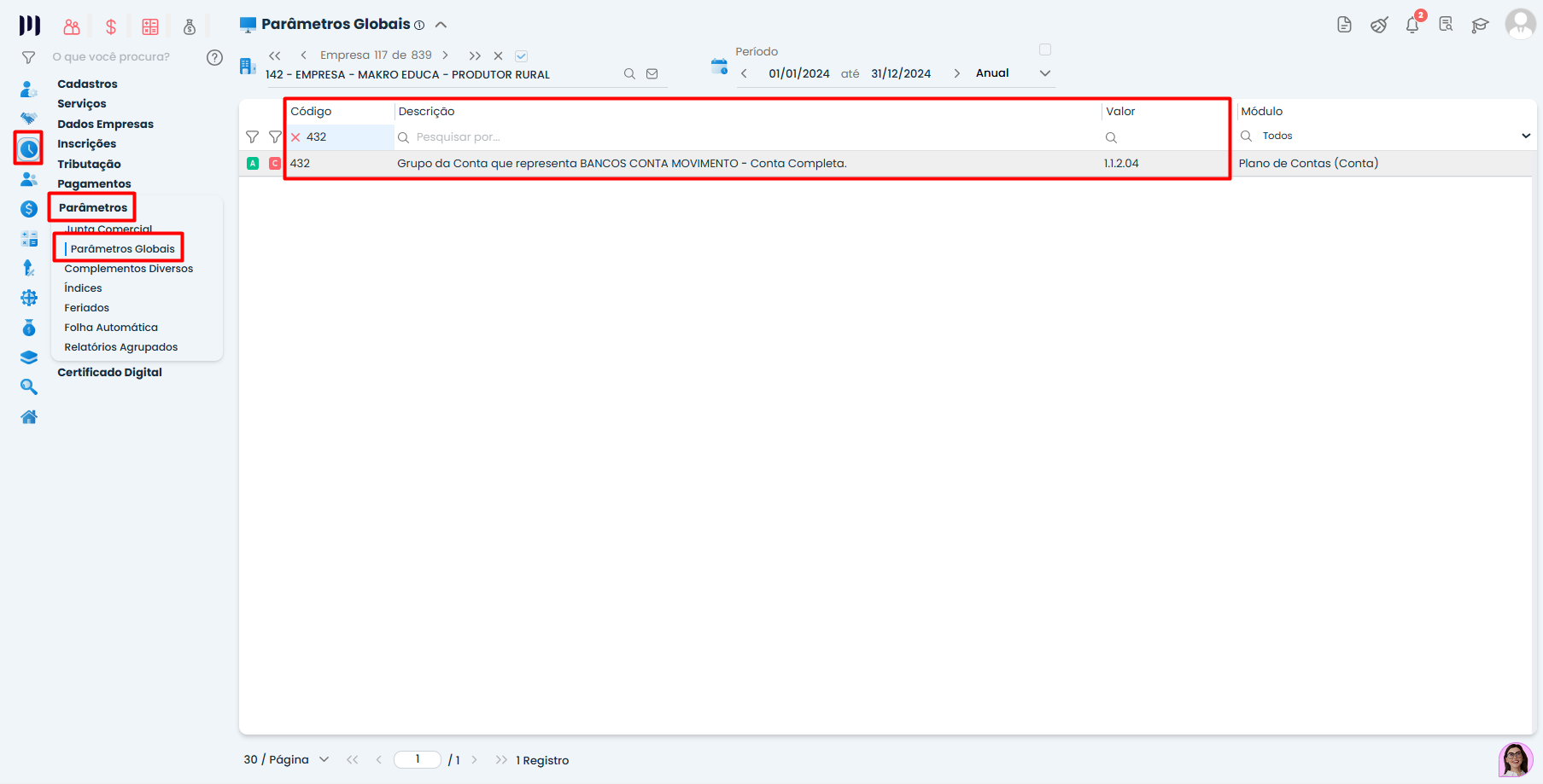 Parâmetro 432: Grupo da conta que representa Bancos Conta Movimento