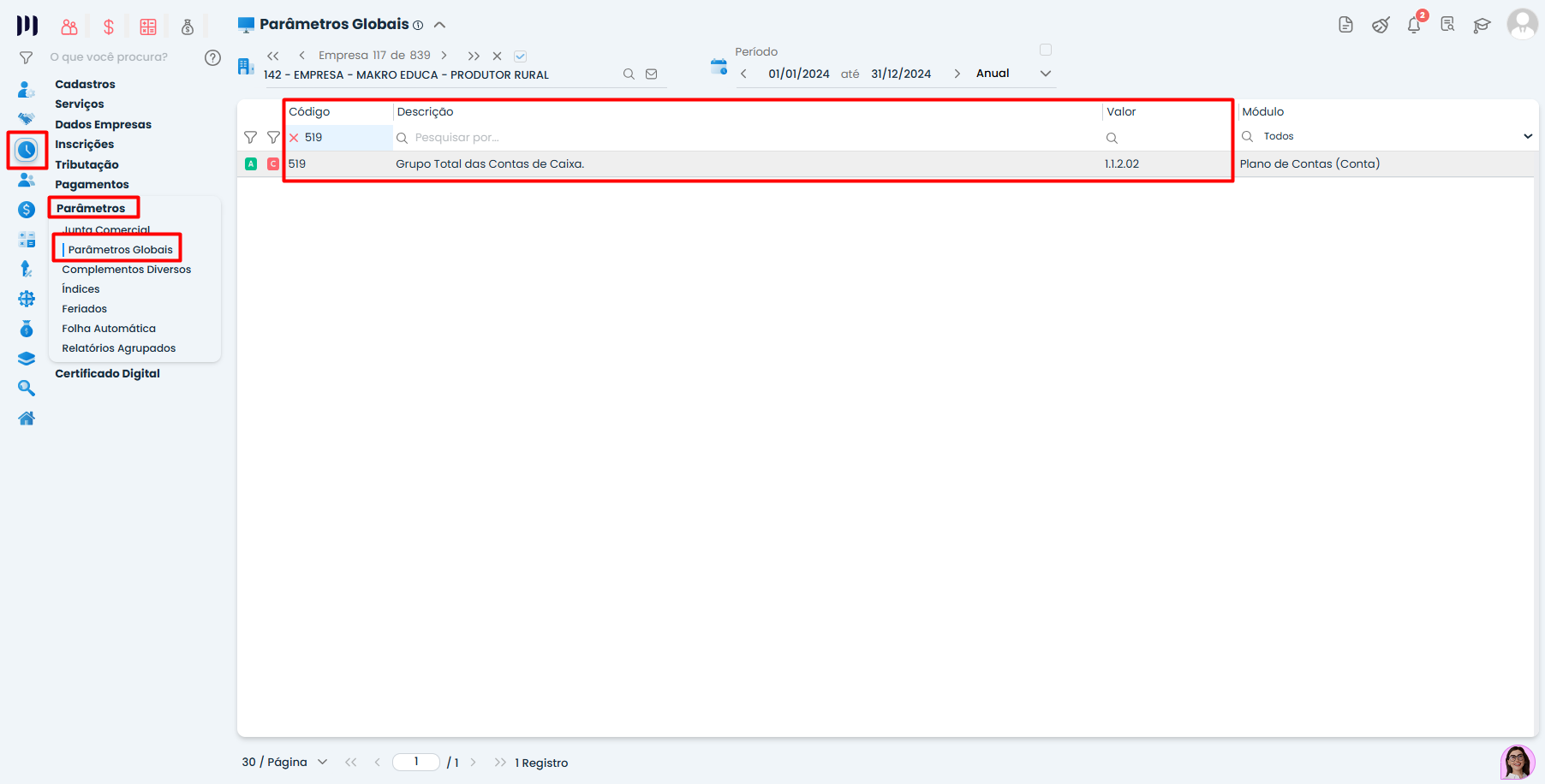 Parâmetro 519: Grupo total das contas de Caixa