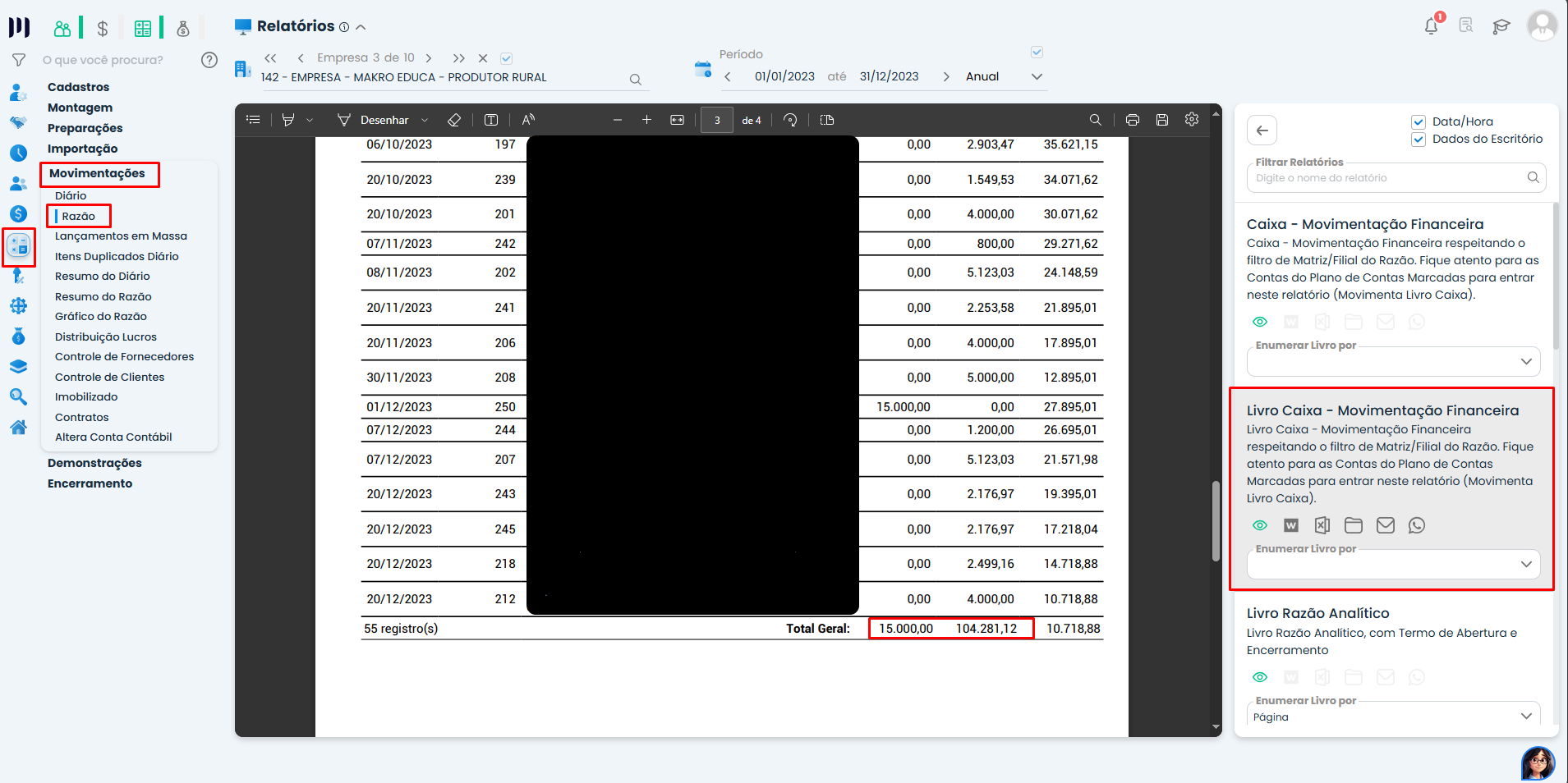 • Gere o relatório Livro Caixa – Movimentação Financeira