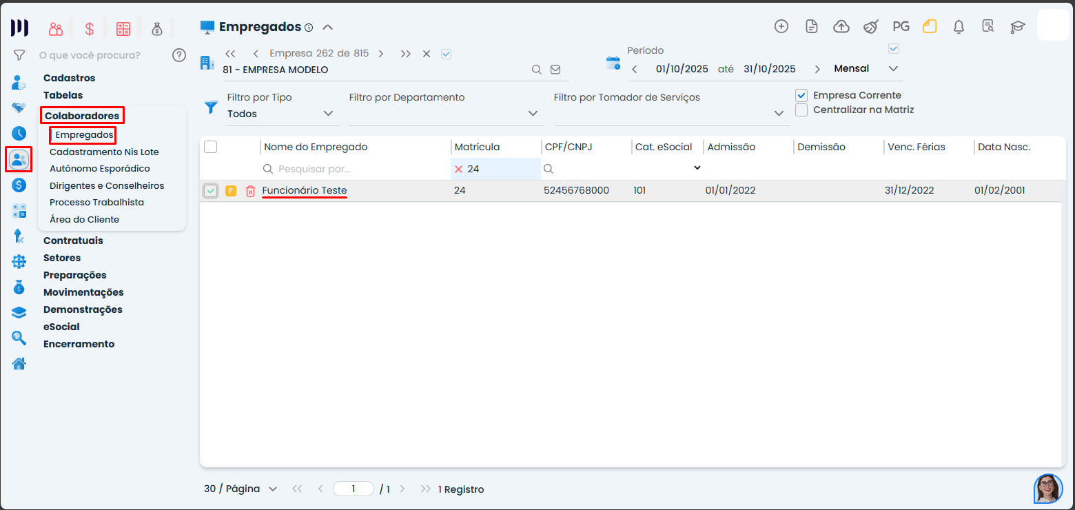 Passo 1: Acesse o menu Pessoal>Colaboradores>Empregados;