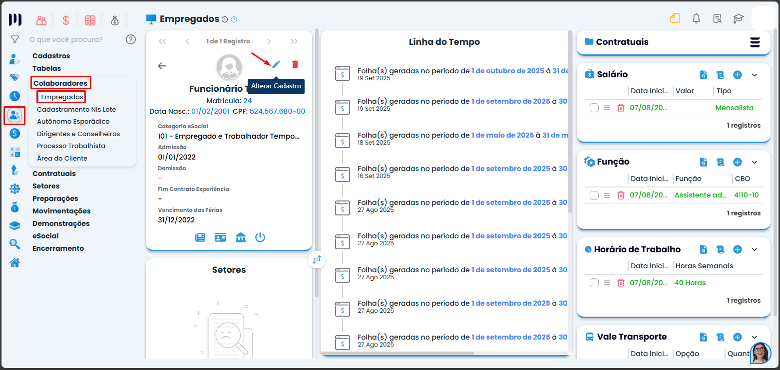 Passo 3: No cadastro do colaborador, clique no ícone ‘Alterar cadastro’;