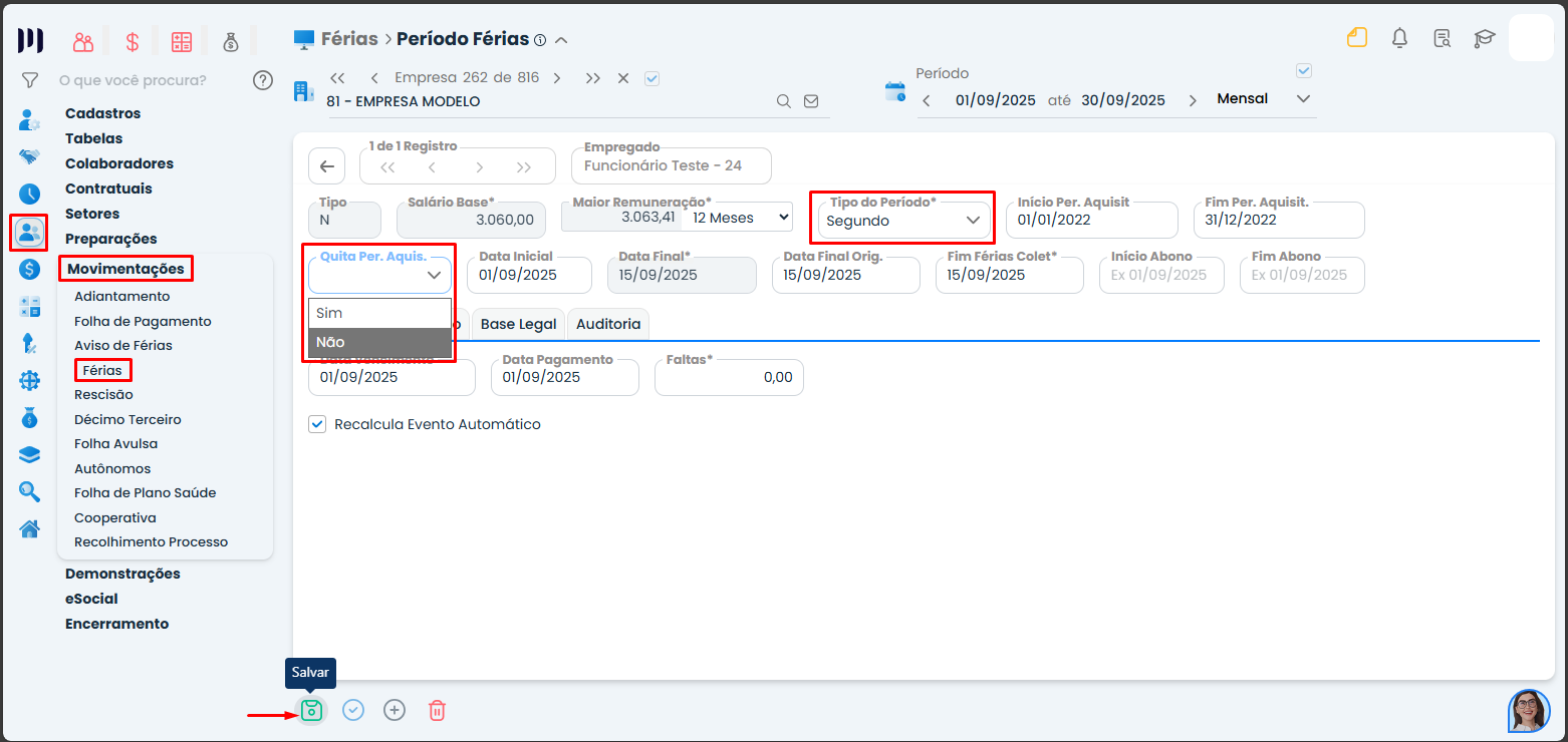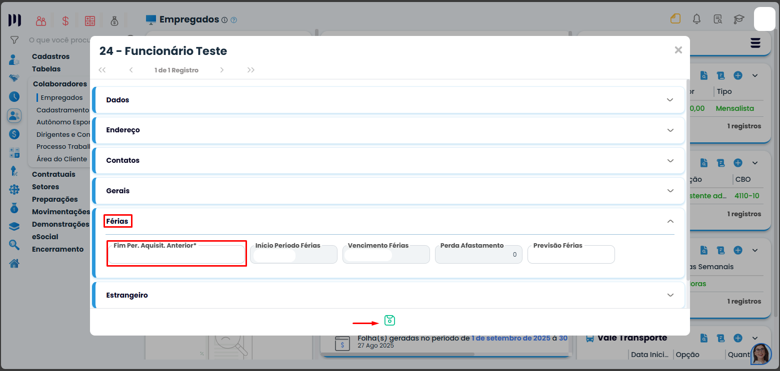 🧩 O correto preenchimento garante que o sistema calcule corretamente os próximos períodos aquisitivos e evita erros em férias futuras.