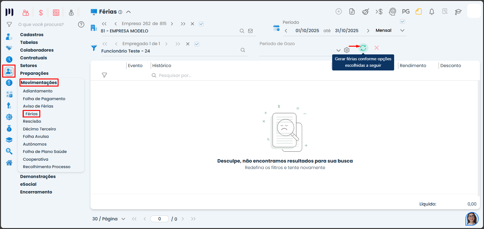 Passo 2: Clique no ícone , ‘Gerar férias conforme opções escolhidas a seguir’;