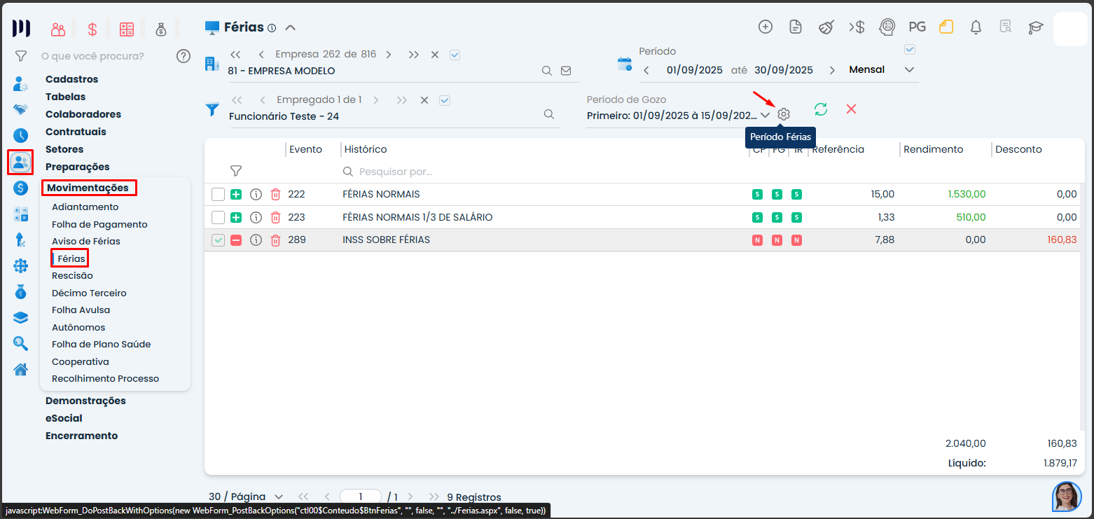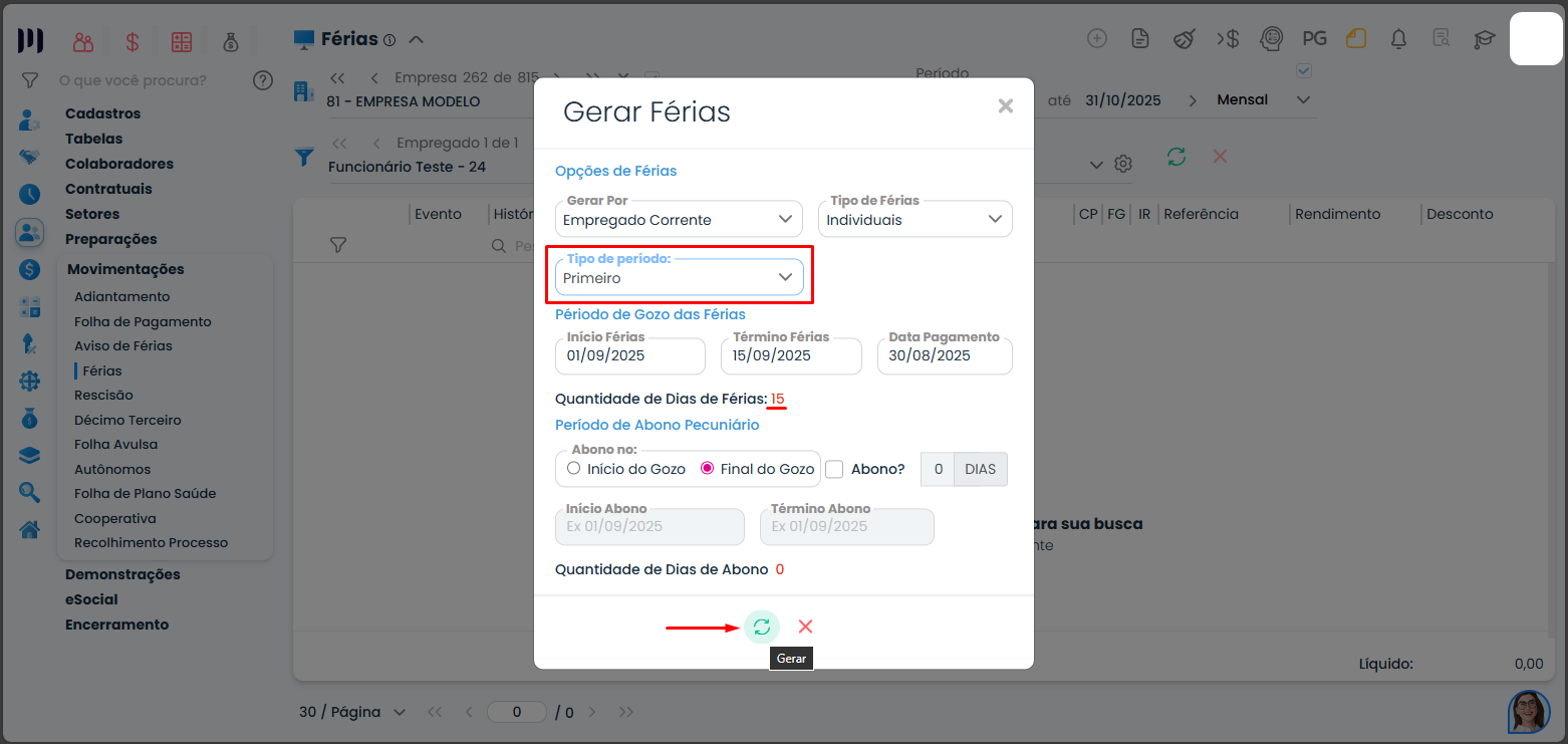 Passo 4: Após gerar as férias, clique no ícone ‘Período Férias’;