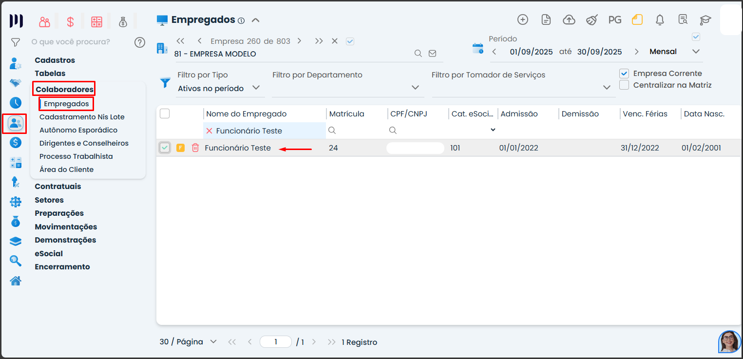 Passo 1: Acesse o menu: Pessoal>Colaboradores>Empregados;