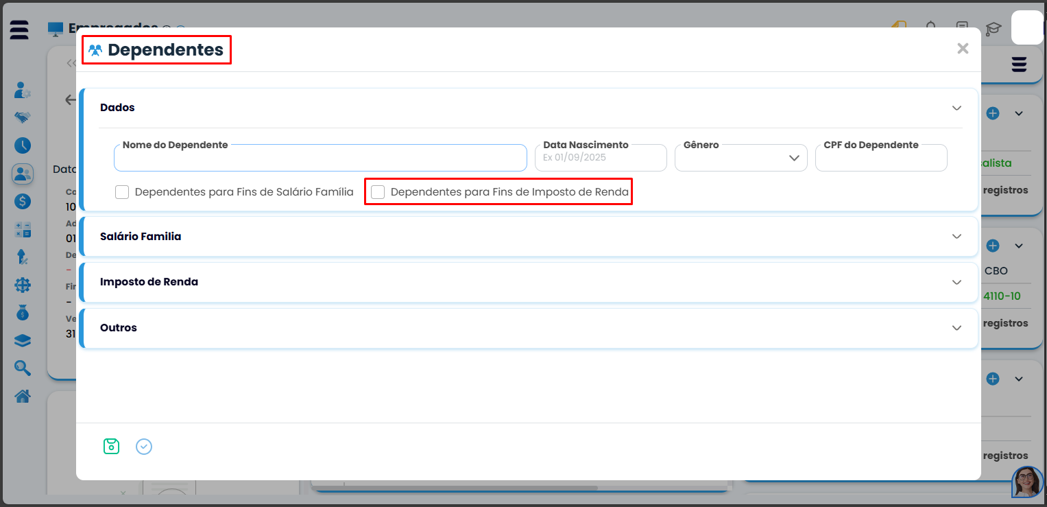 Passo 5: Na aba ‘Dados’, preencha todas as informações do dependente e marque a opção ‘Dependentes para fins de imposto de renda;