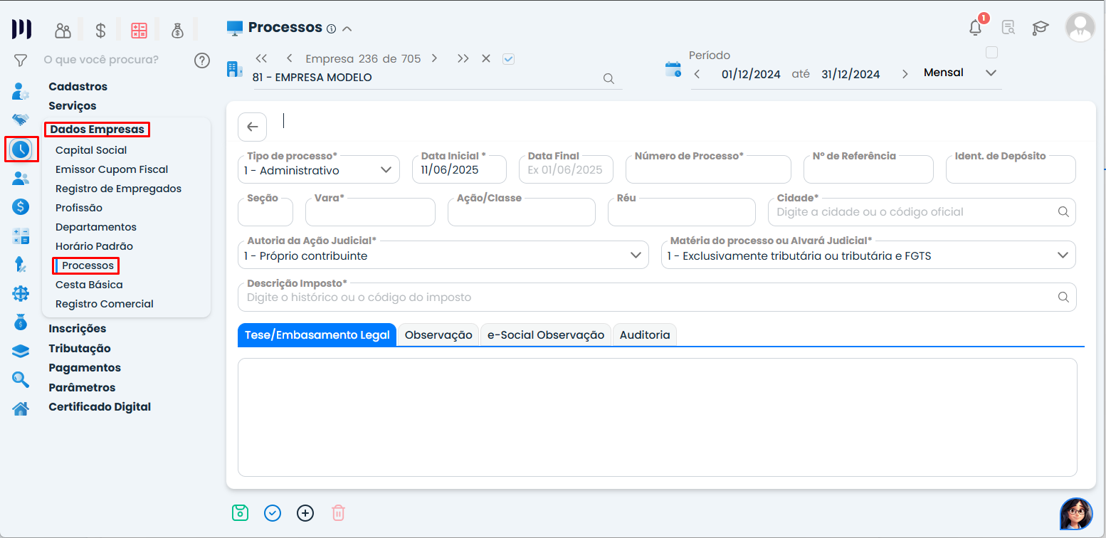 Clique em Processos e faça o cadastro necessário
