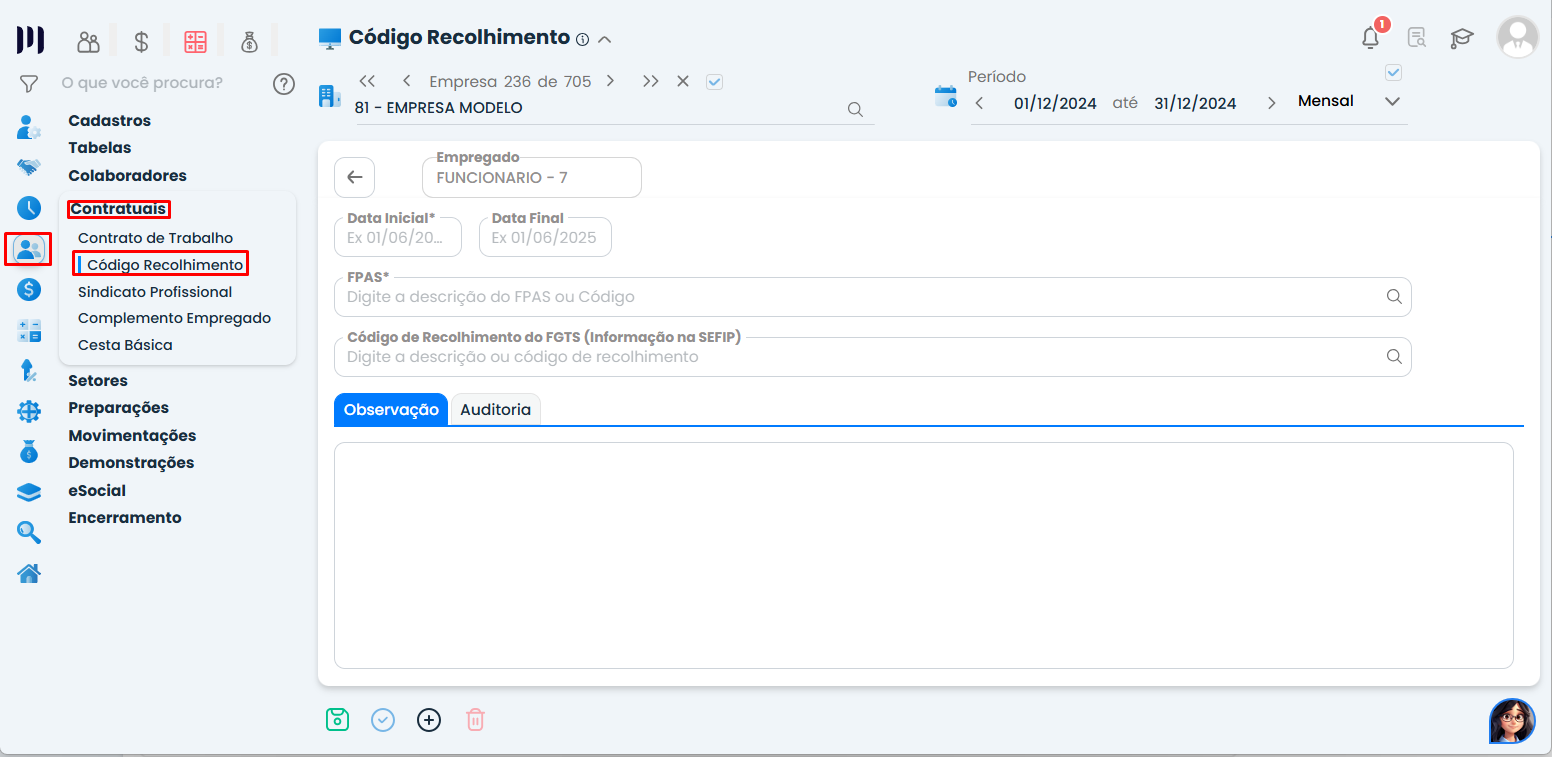 Passo 3: Configure o código de recolhimento 650 para o funcionário:
