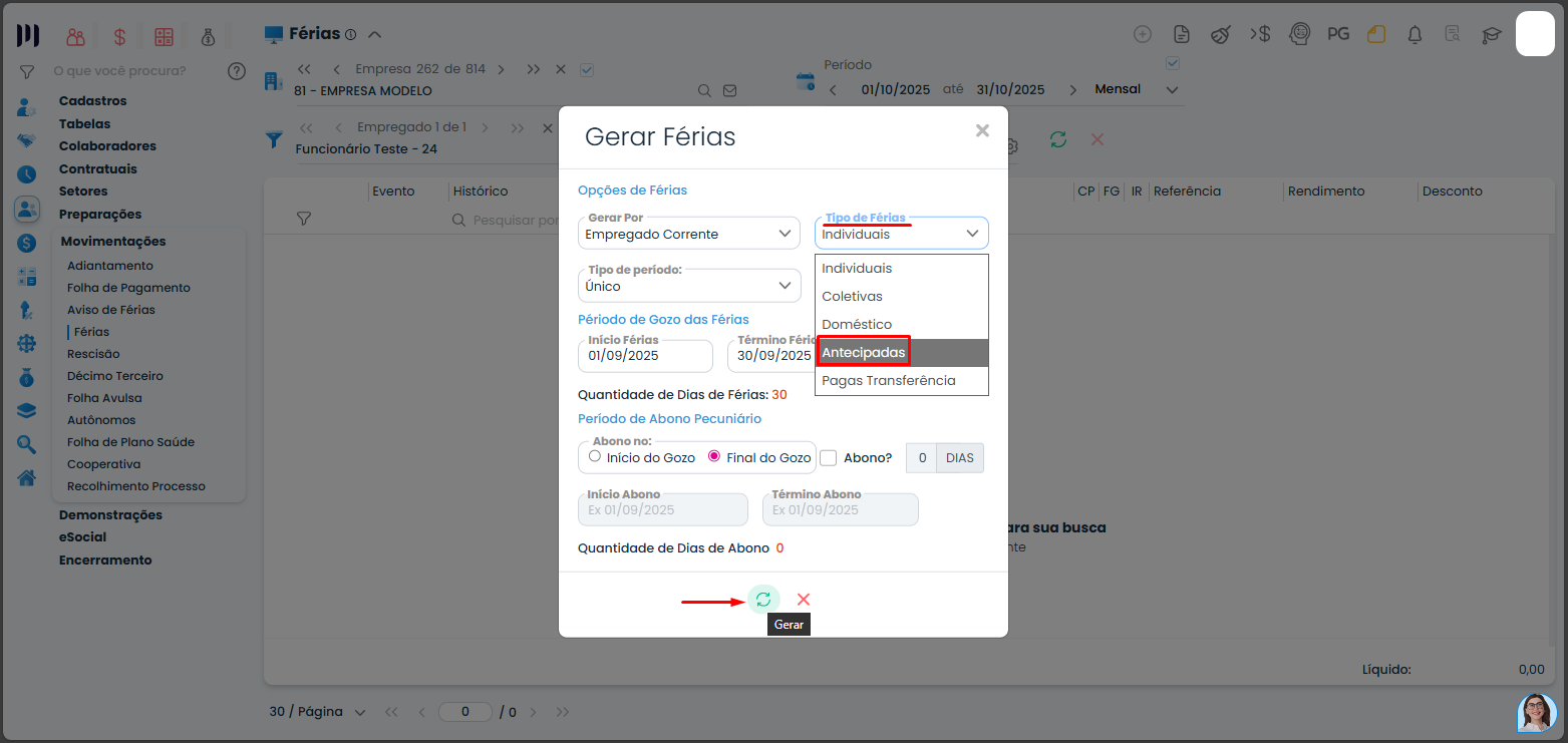 Você pode gerar férias antecipadas de forma simples e rápida. O procedimento é semelhante ao das férias convencionais.