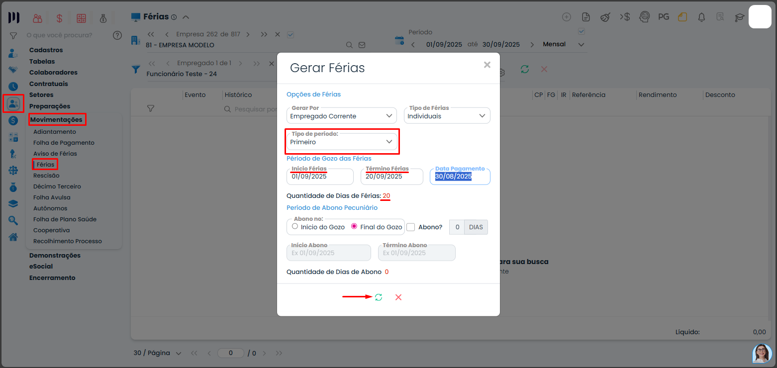 Passo 3: Clique no ícone “Gerar férias conforme opções escolhidas a seguir”;