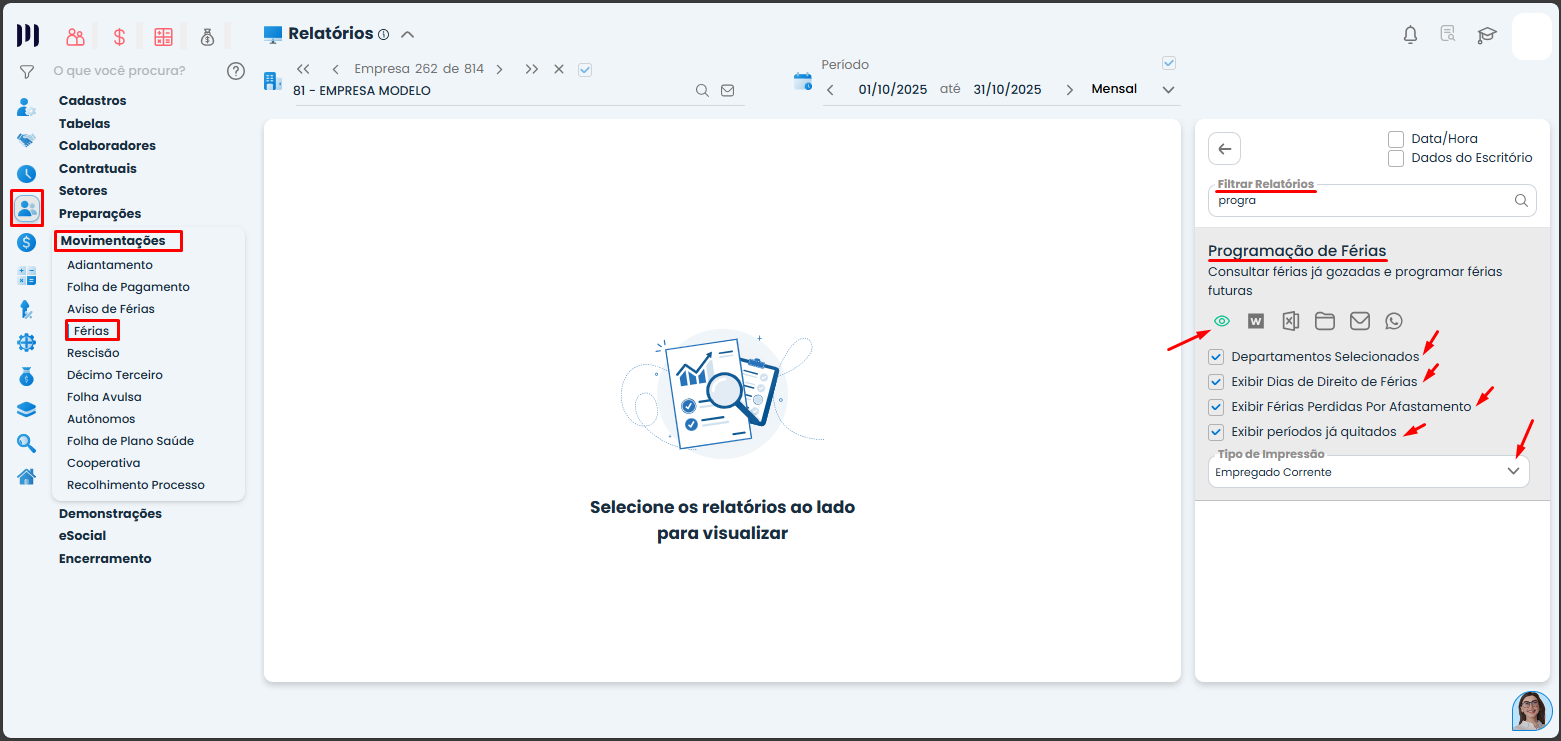 Passo 5: Preencha os filtros como desejado e clique e clique no ícone para visualizar e emitir o relatório;