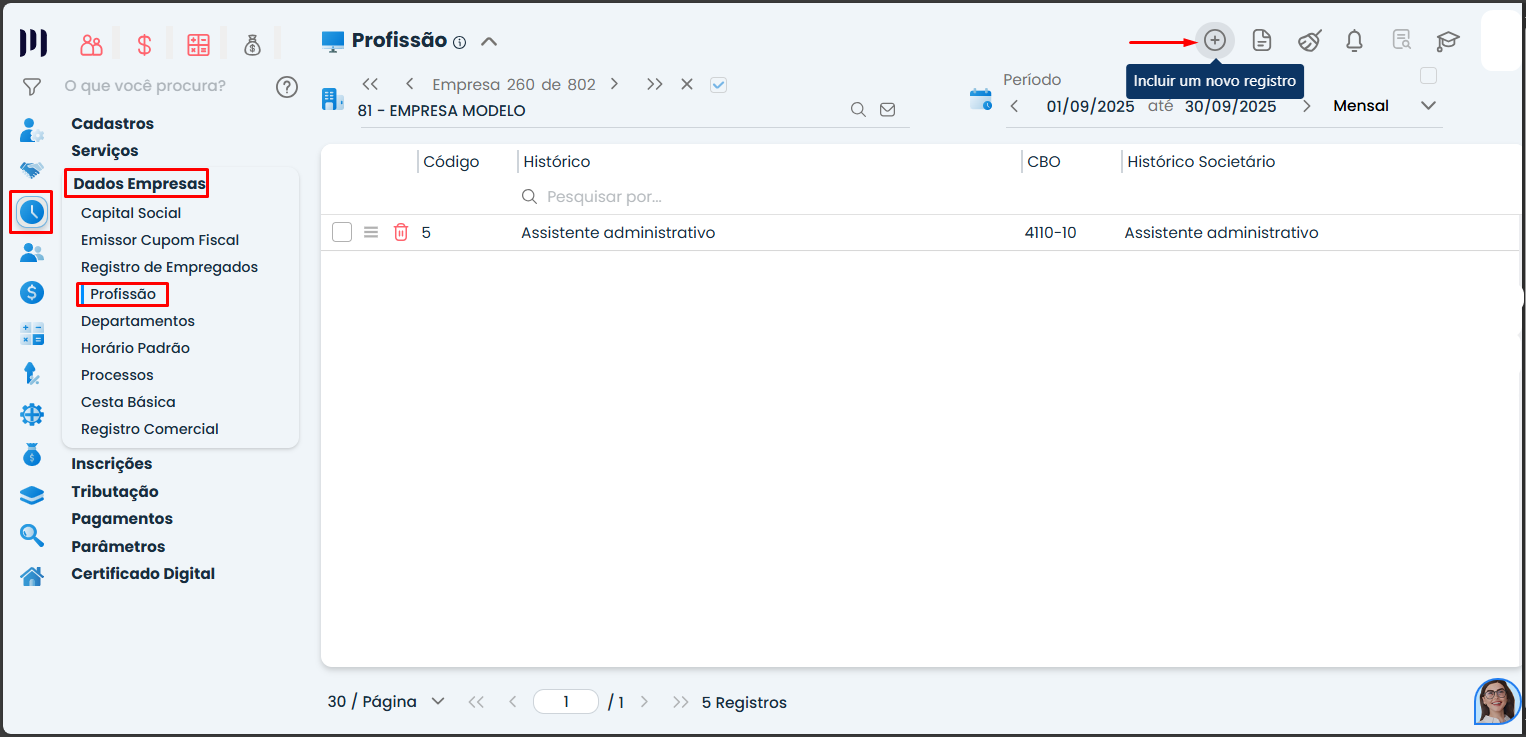 Passo 2: Na tela de profissão, clique no botão “Incluir novo registro”.