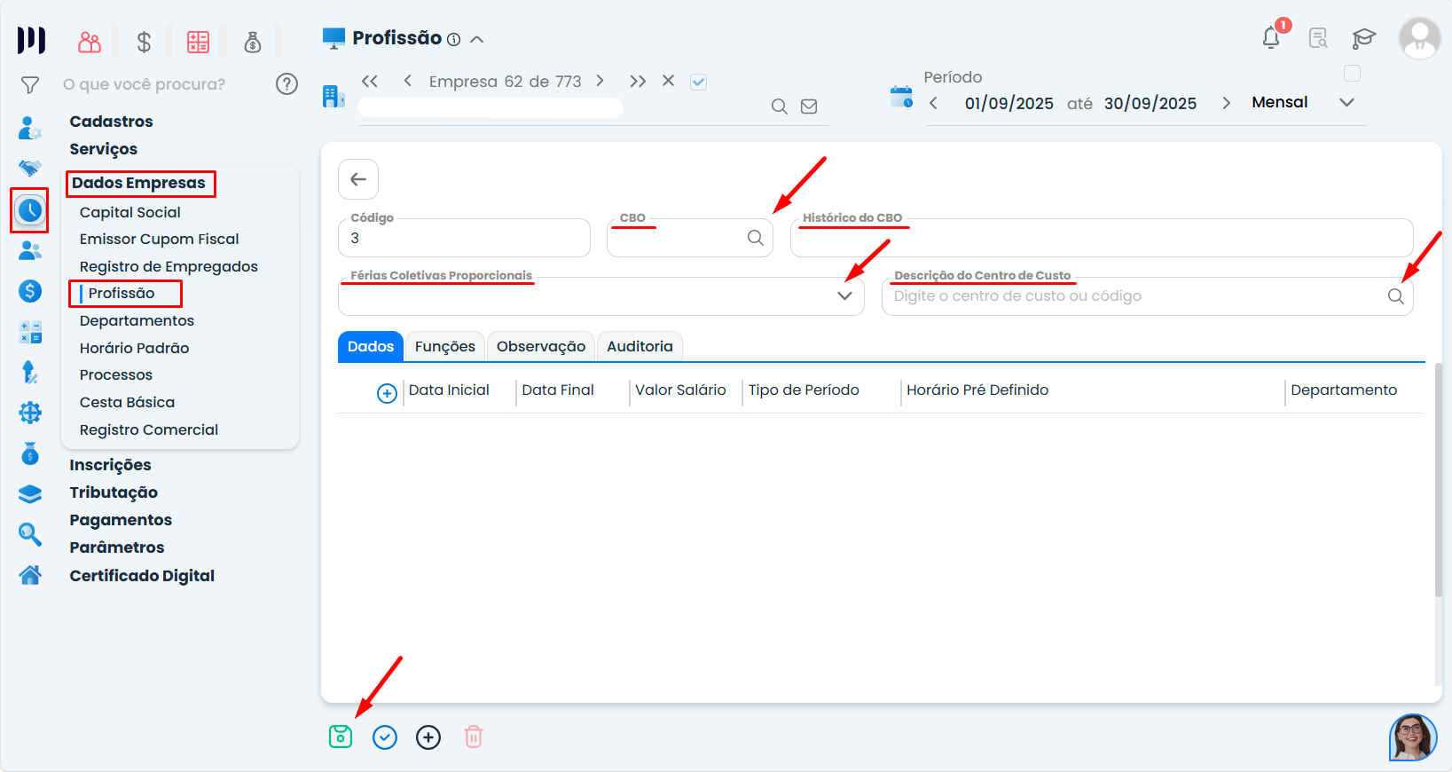 Passo 1: Clique em Preparar>Dados Empresas>Profissão.