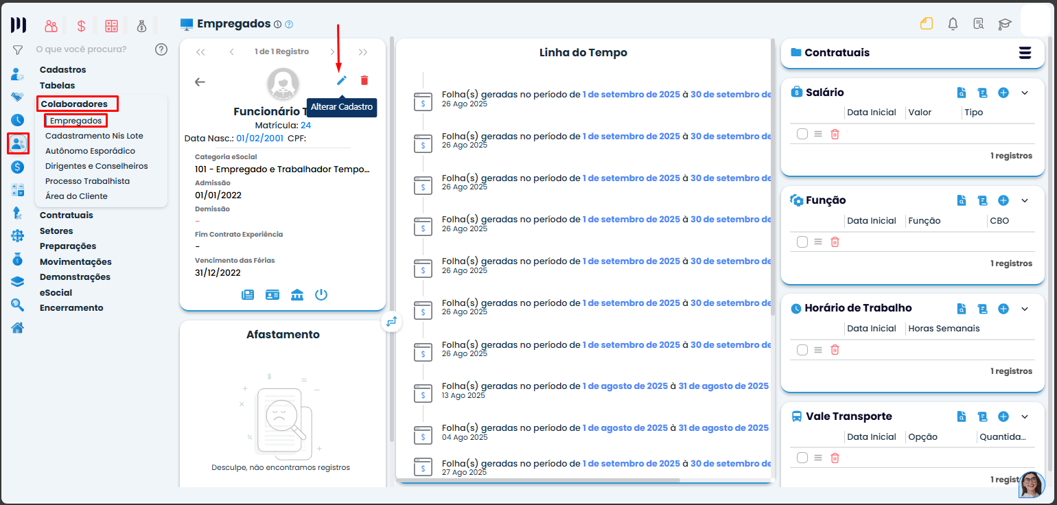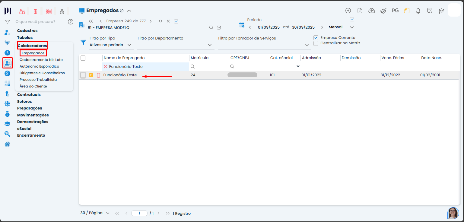 1º passo: Acesse o cadastro do colaborador: Pessoal>Colaboradores>Empregados;