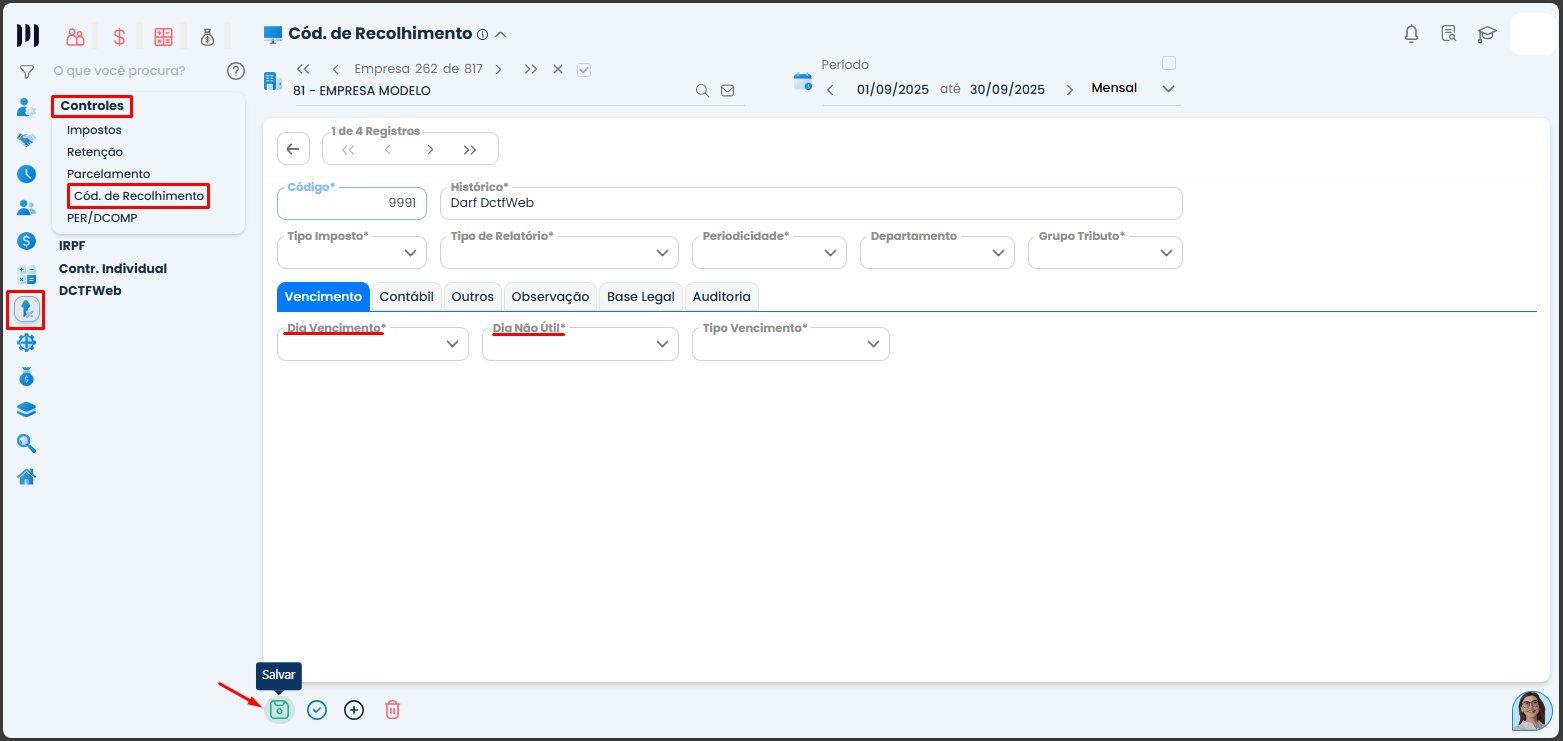 Passo 1: Acesse o menu Tributos>Controles>Códigos de Recolhimento;