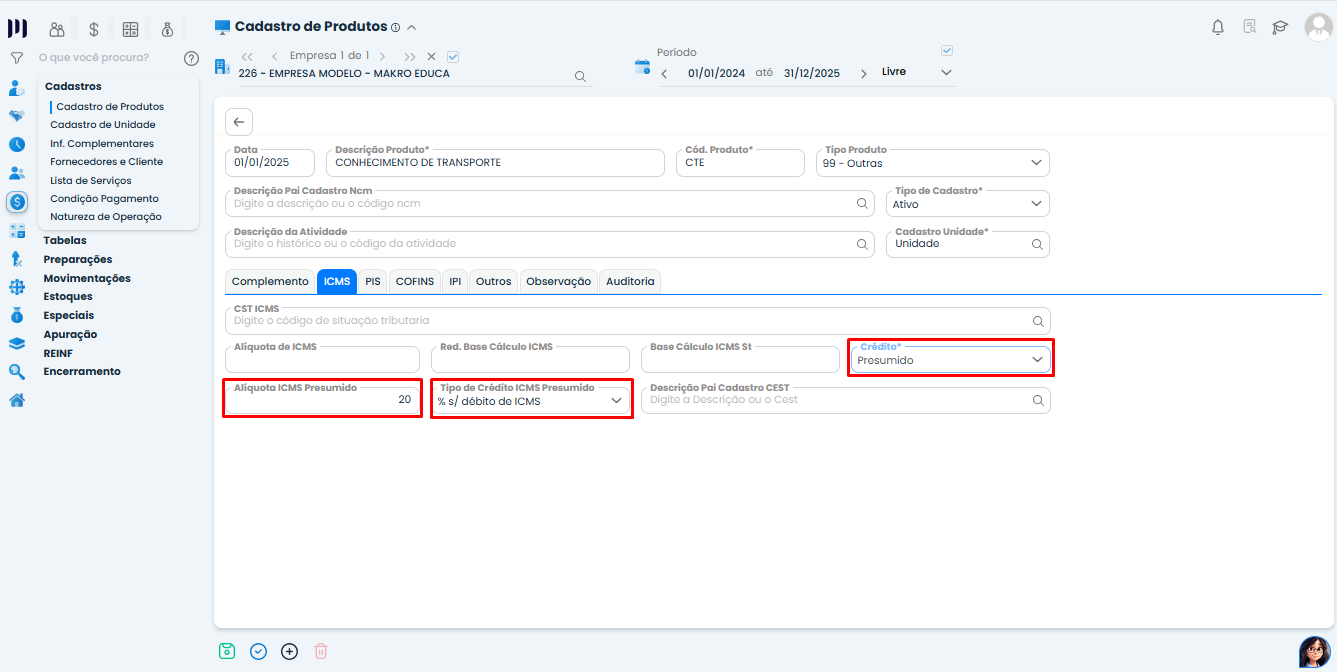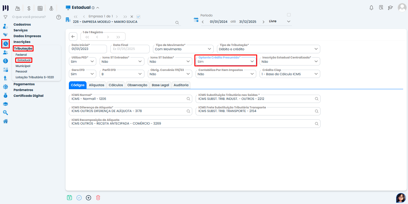 Você precisará fazer essa parametrização quando sua empresa for optante pelo crédito presumido de ICMS, um regime especial que permite o aproveitamento de créditos com base em percentuais pré-definidos.