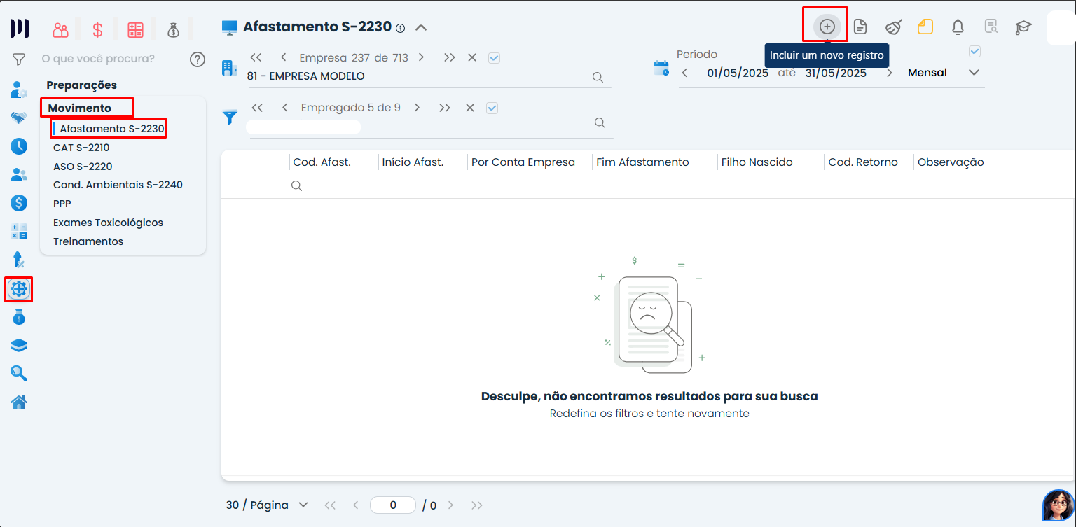 Passo 1: Acesse o menu Pessoal>SESMT>Movimento e depois em Afastamento S-2230.