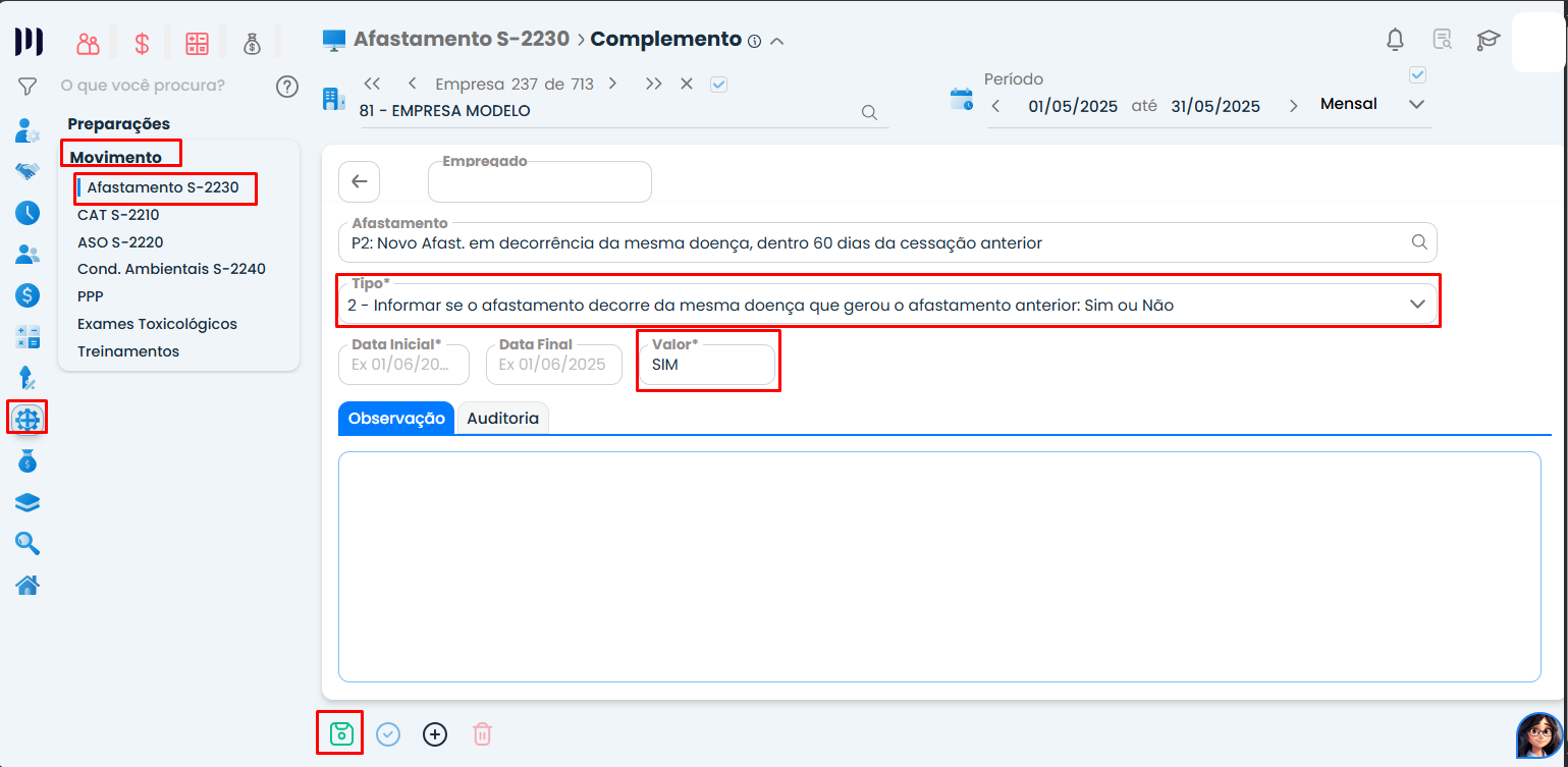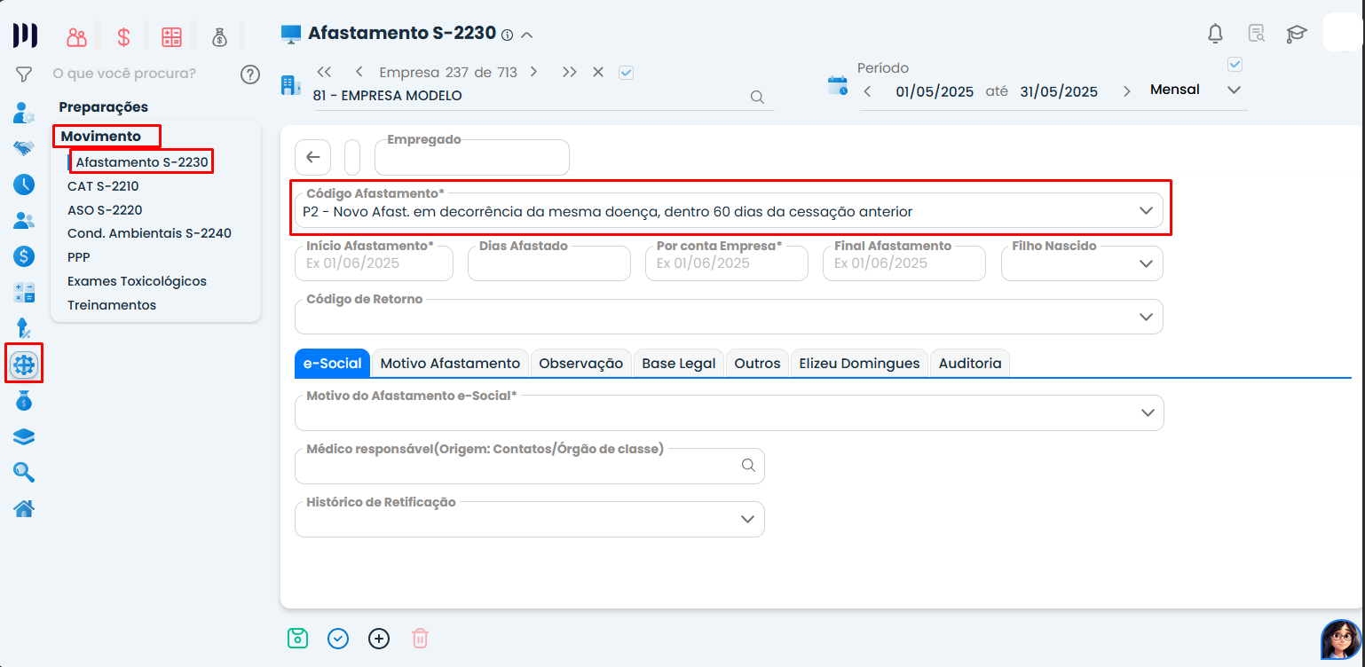 Passo 3: Preencha as datas do afastamento, o código de retorno e motivo para o esocial;