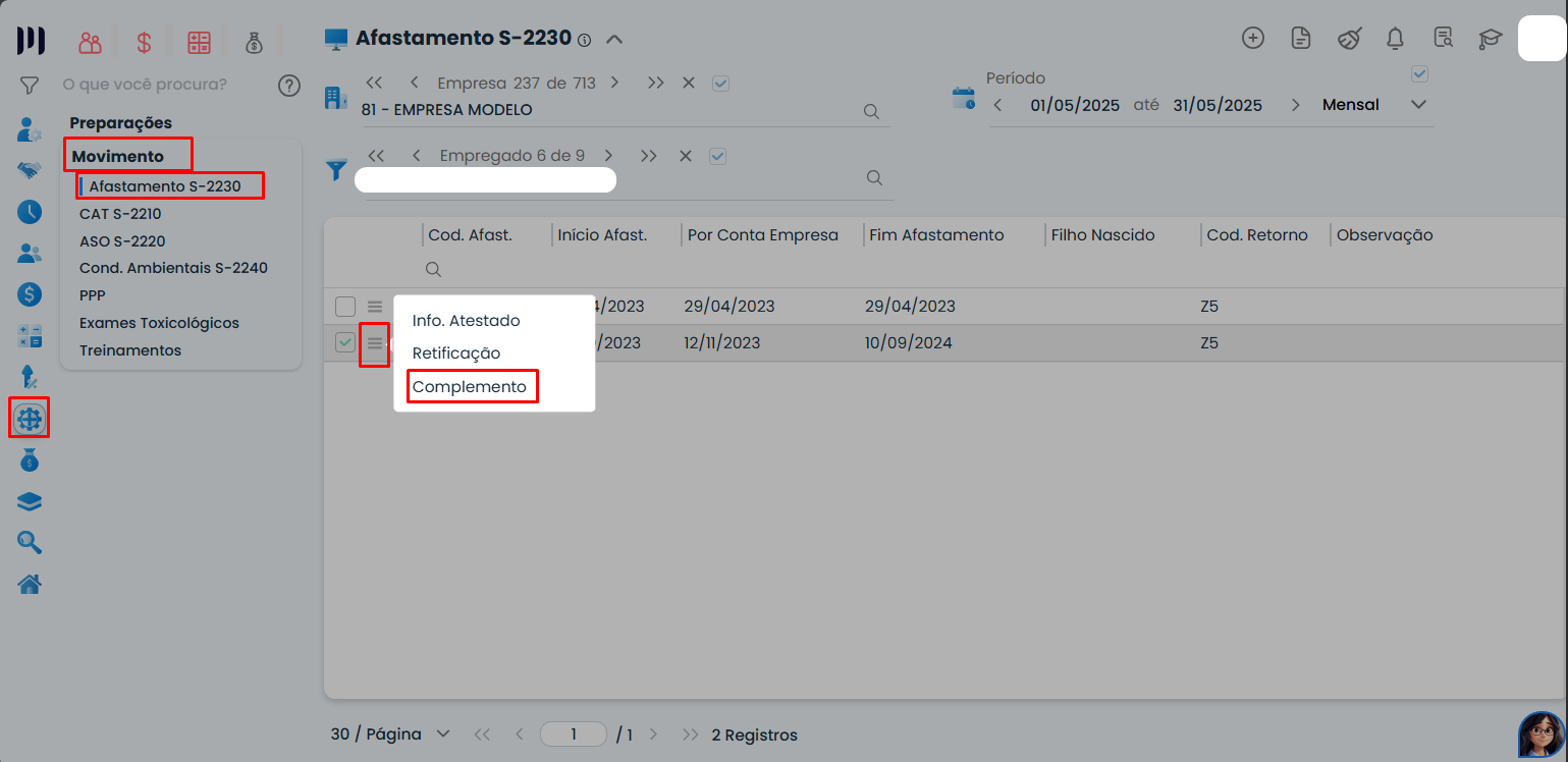 Passo 4: Após salvar, clique no subnível do afastamento cadastrado e selecione a opção Complemento.