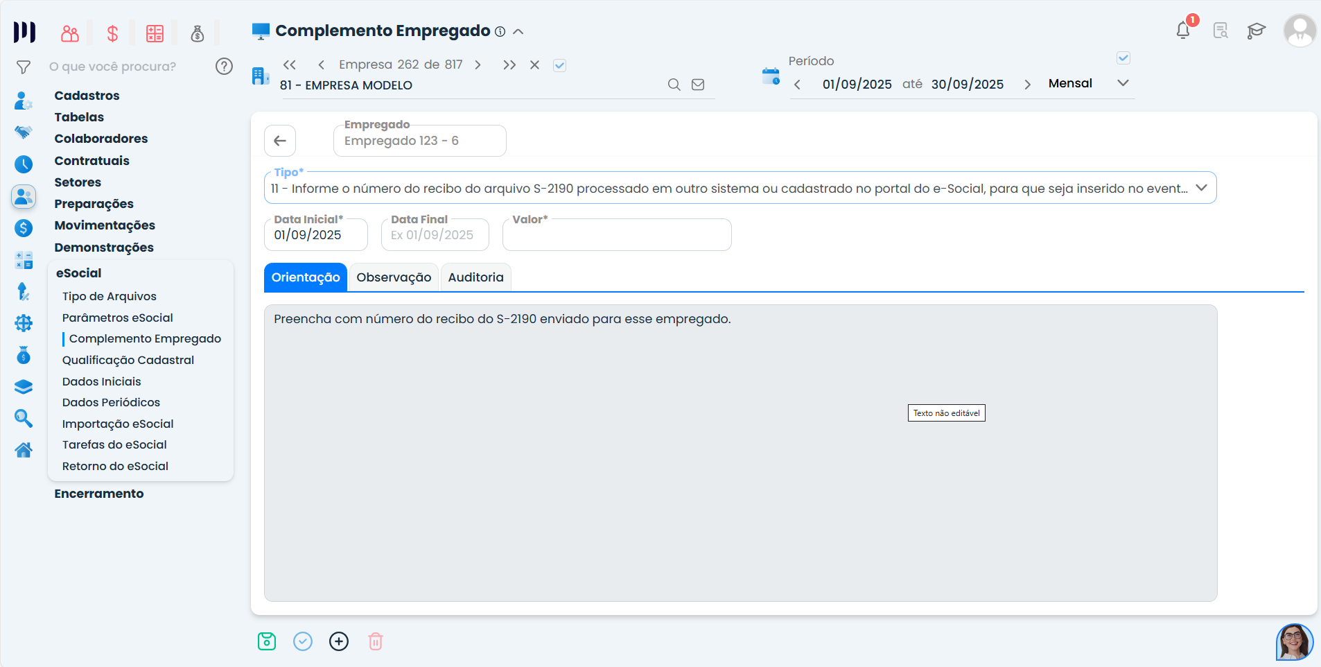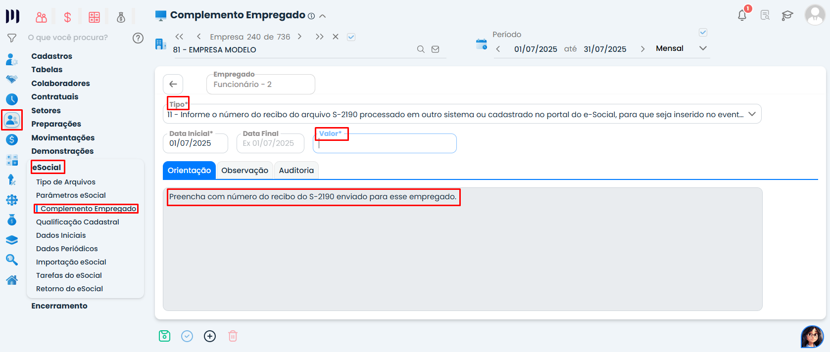 Na tela de complemento, clique em Incluir e selecione o tipo 11. No campo solicitado, insira o número do recibo de entrega do evento S-2190 que foi enviado de outro sistema ou diretamente no portal do eSocial;