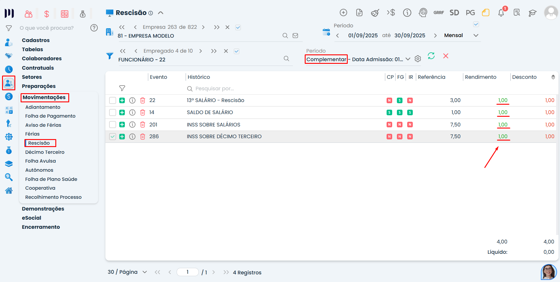 Insira os valores corretos manualmente nos eventos que permanecerem, pois o sistema não calcula automaticamente a rescisão complementar;