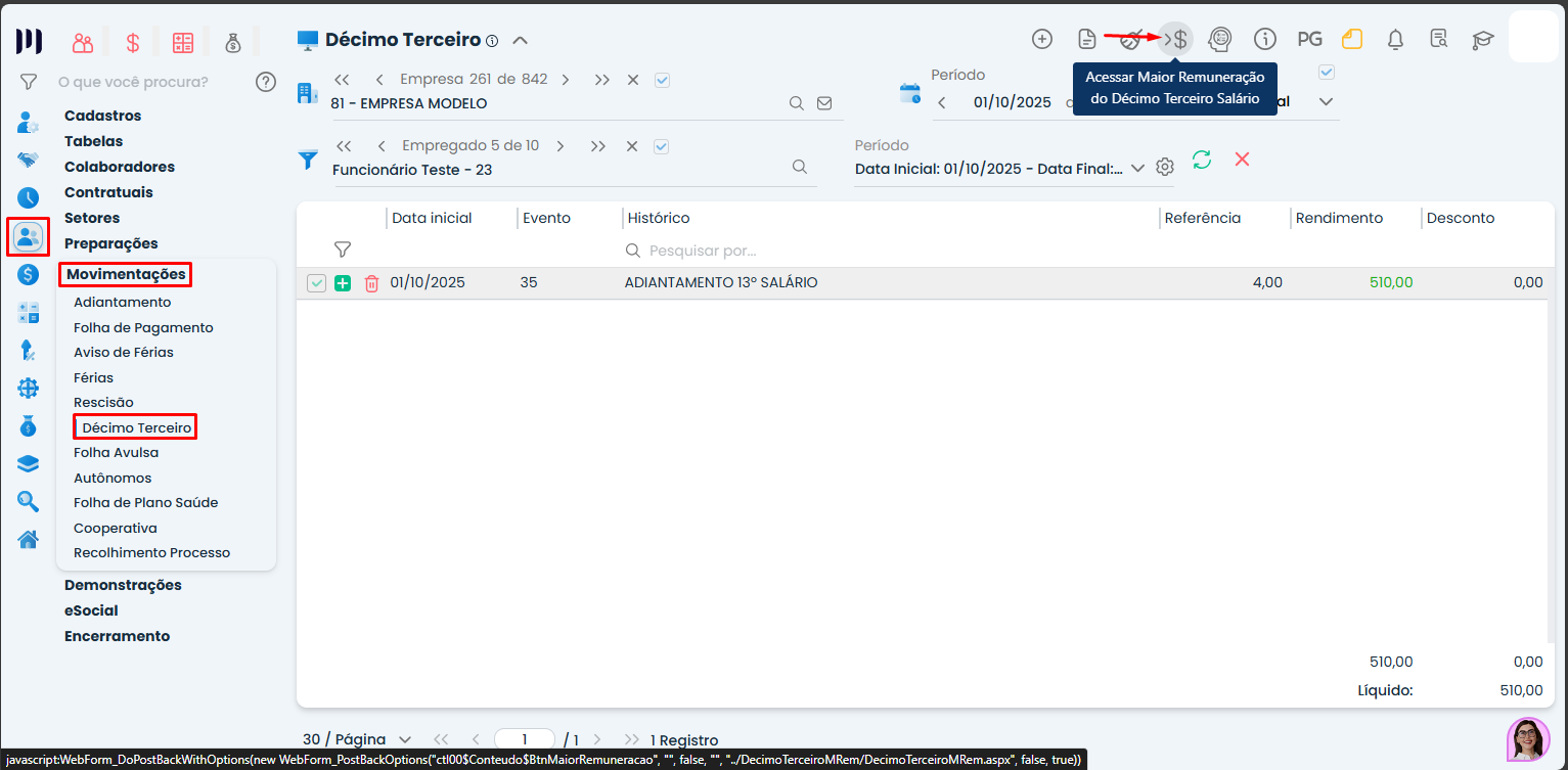 Passo 1: Acesse o menu Pessoal>Movimentação>Décimo Terceiro;