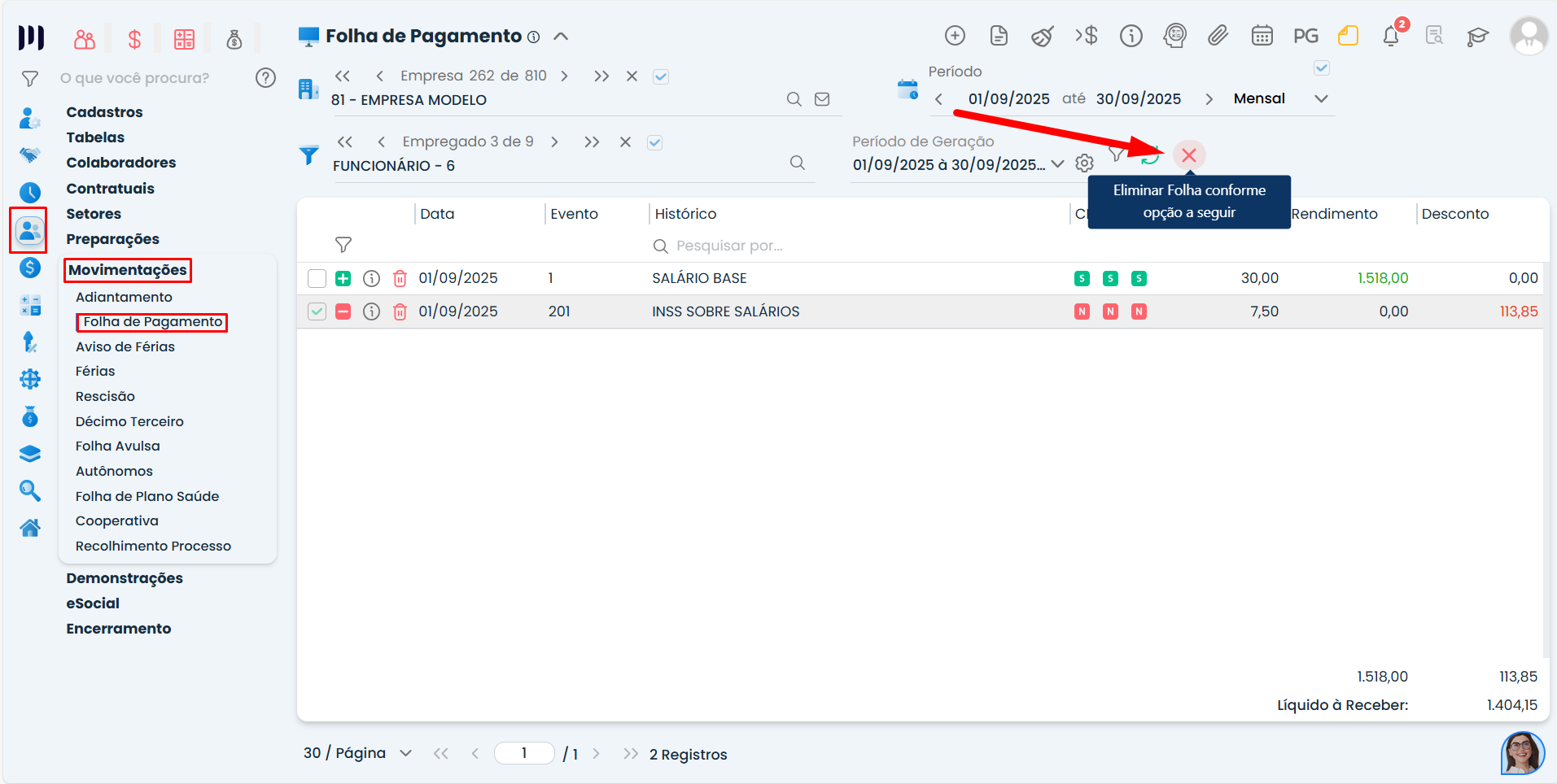 Passo 6: Após eliminar a folha, gere-a novamente para que o arredondamento correto seja aplicado no cálculo.