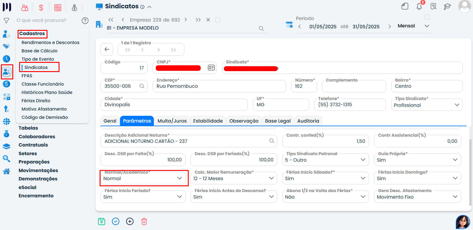Observação: A classificação como acadêmico ou normal altera a fórmula aplicada no cálculo do DSR para refletir corretamente o regime do sindicato.