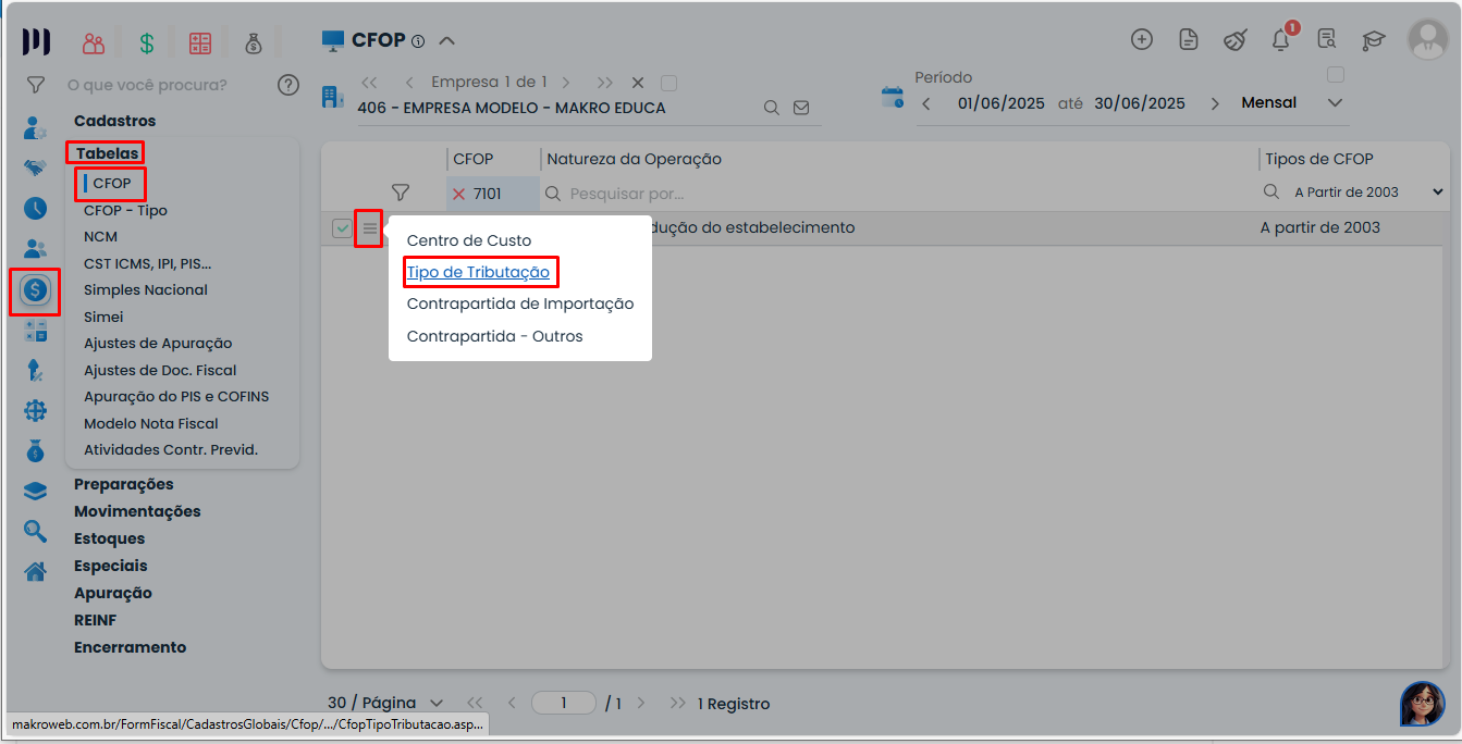 Acesse: Fiscal > Tabelas > CFOP > Três risquinhos > Tipo de Tributação