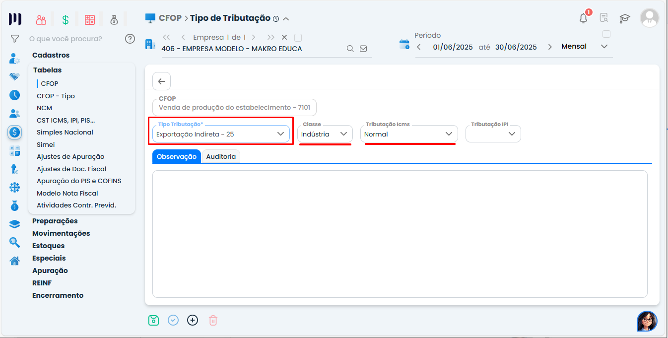 Configuração do Tipo de Tributação para Operações com CFOP de Exportação
