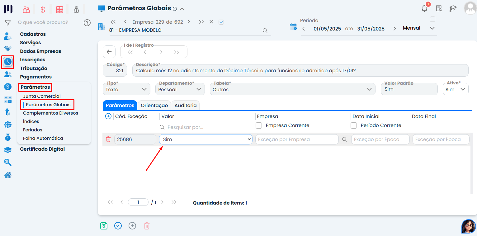 Vamos resolver isso juntos! O parâmetro global 321 define se o cálculo do adiantamento do 13º salário deve incluir ou não o mês de dezembro. Dependendo dessa configuração, o valor antecipado pode ser maior ou menor.
