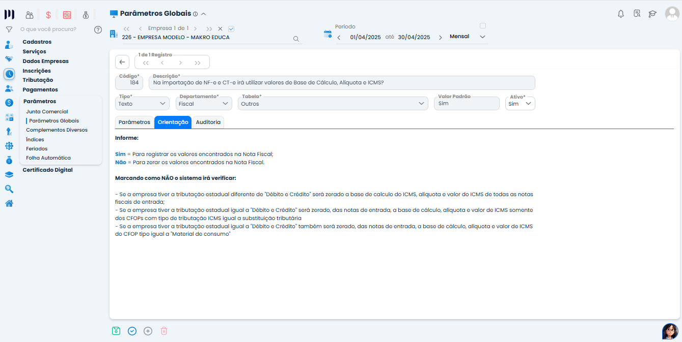 Sim: Para manter os valores de ICMS da nota fiscal (não recomendado para Simples Nacional).